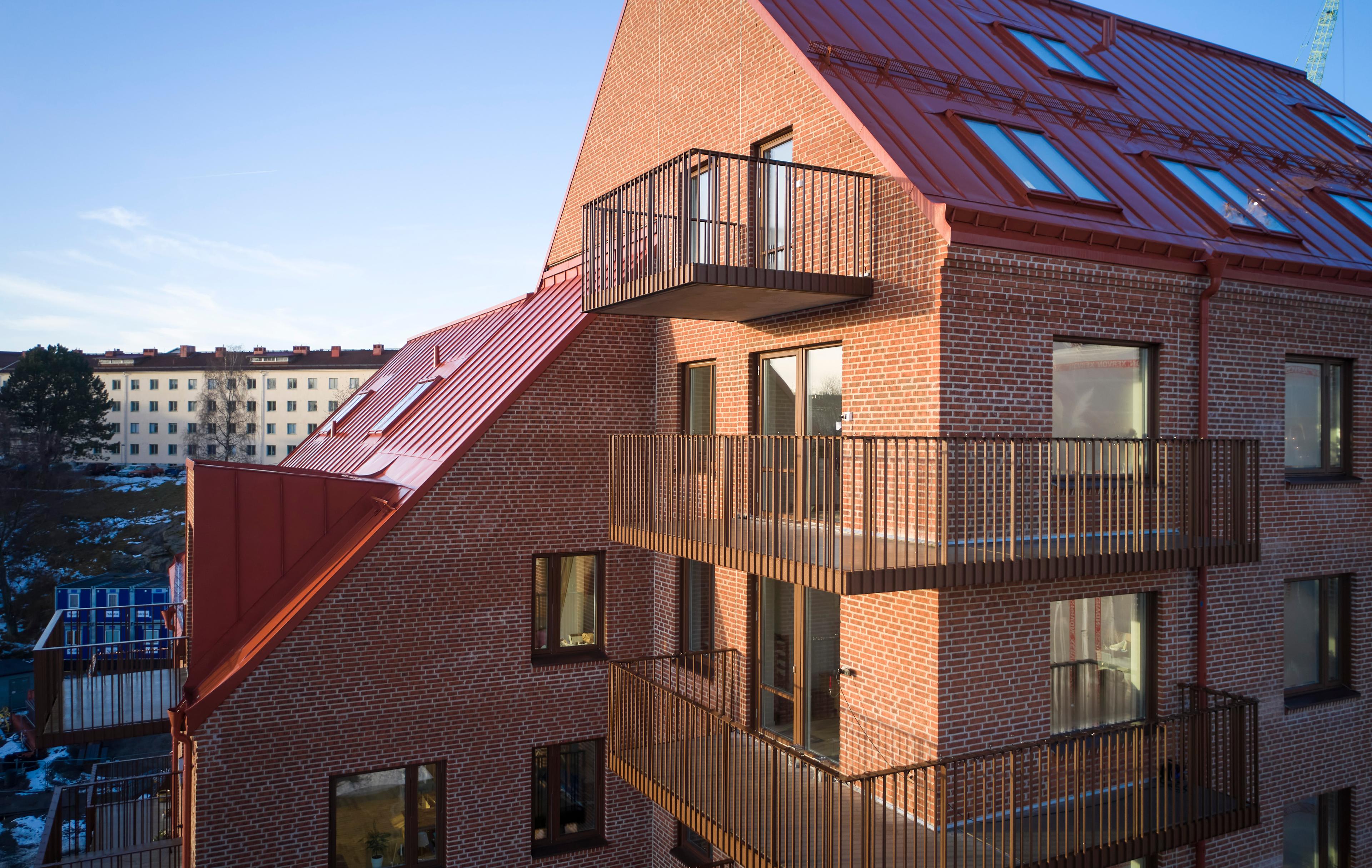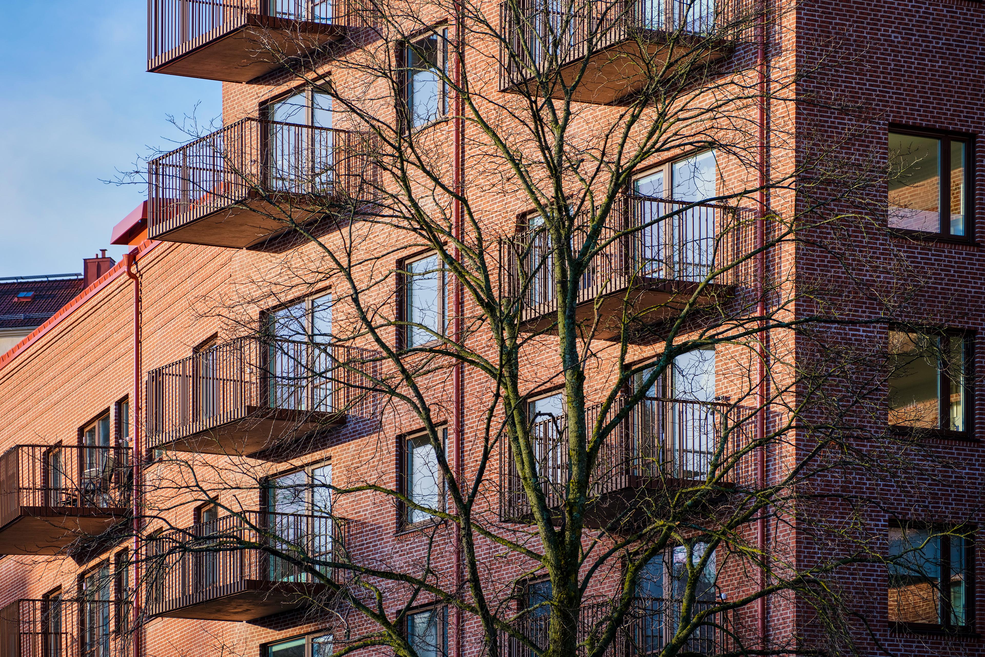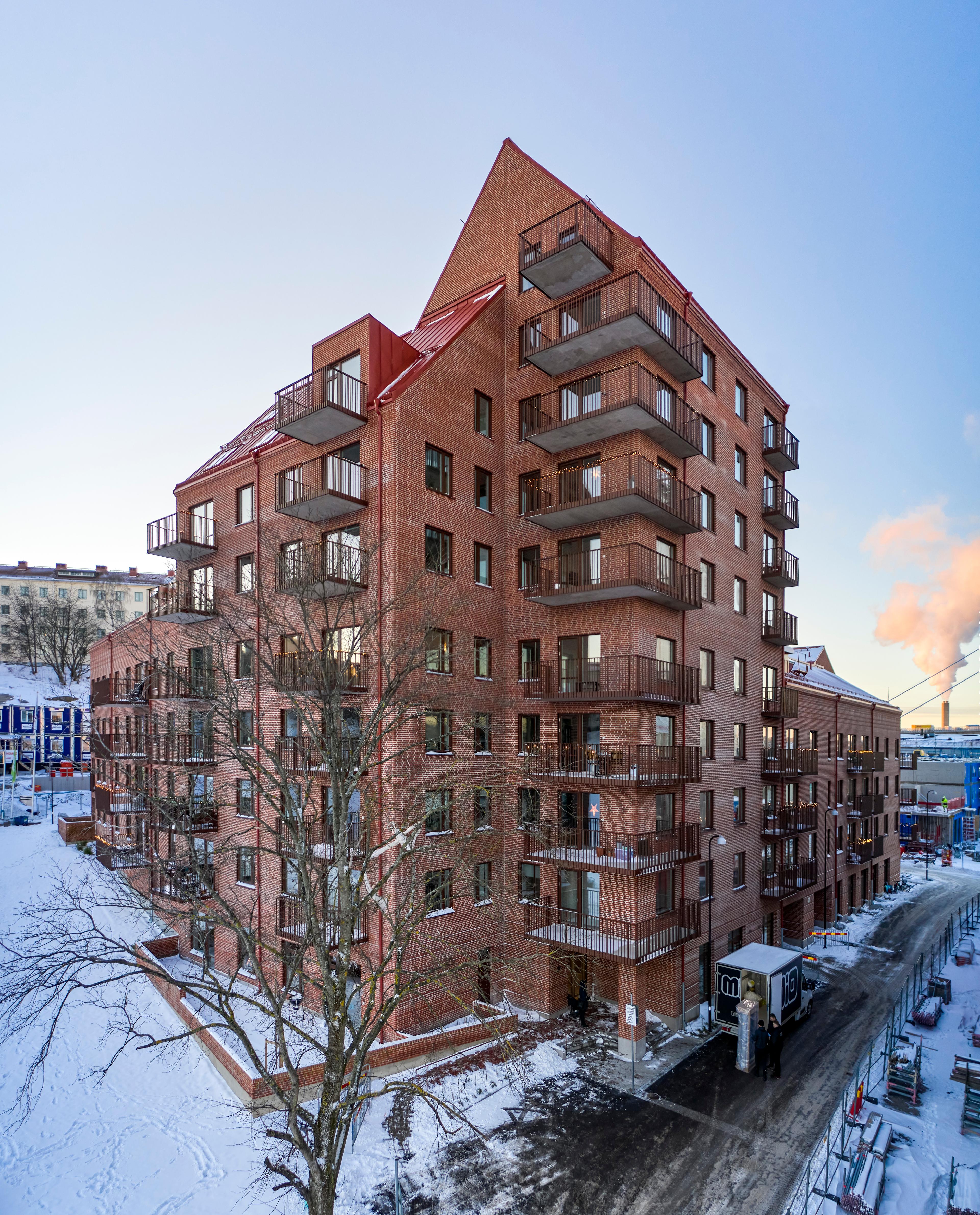 Bränneriet är färgsatt med olika röda kulörer. Fasaden har ett vanligt traditionellt rött tegel men murat med baksidan utåt. På baksidan finns märken efter tegelbränningen. De bildar ett oregelbundet mönster som ger karaktär åt fasaden på nära håll. Entréer har en tydlig utformning för att skapa händelser i gaturummet. Längs Walter Bengtssons gata finns studiolägenheter med stora fönsterpartier och entré direkt från gatan. Kvarterets form har gett upphov till en stor variation av olika typer av lägenheter, sammanlagt 134 st. I uppdraget har även planering av utemiljön ingått.