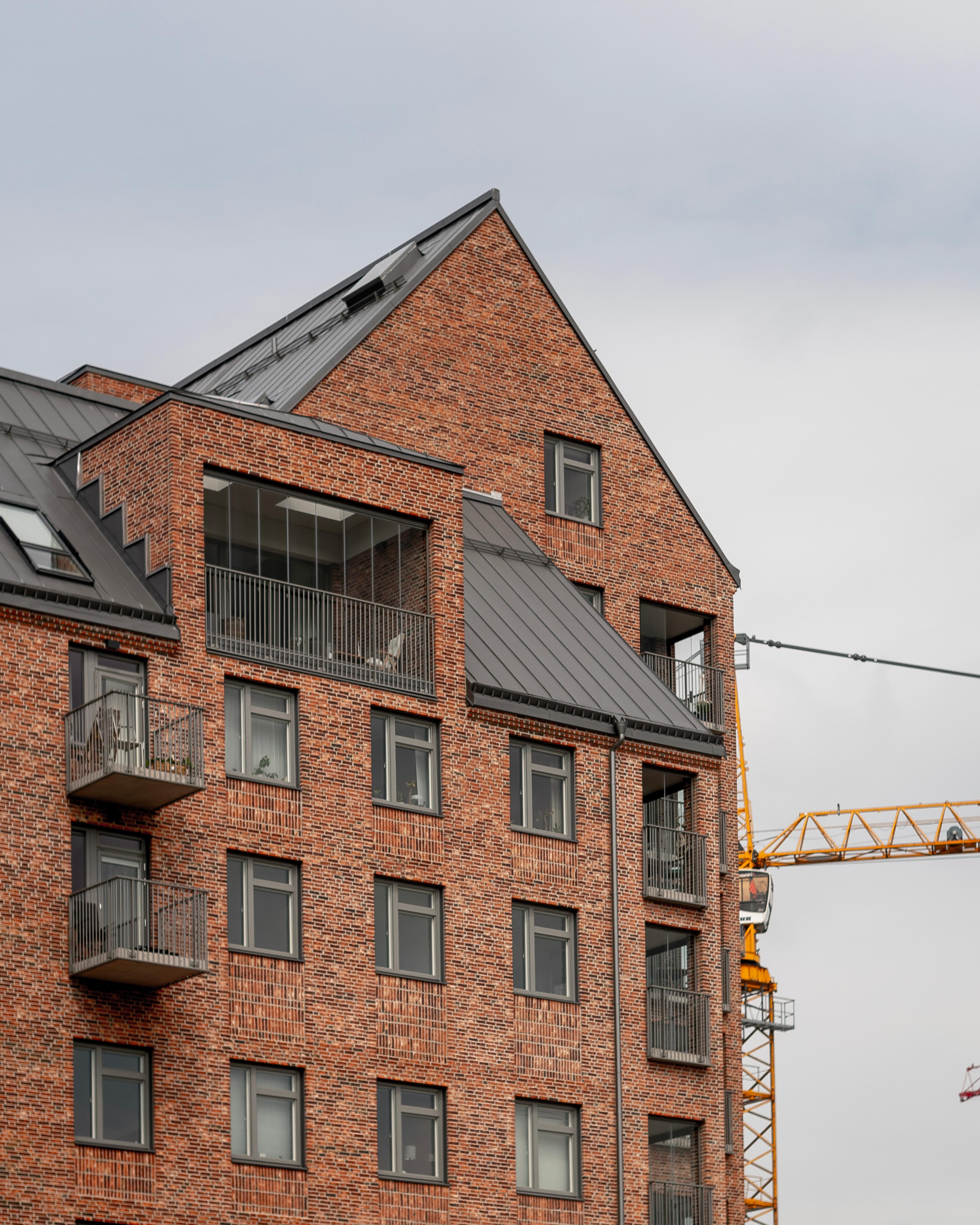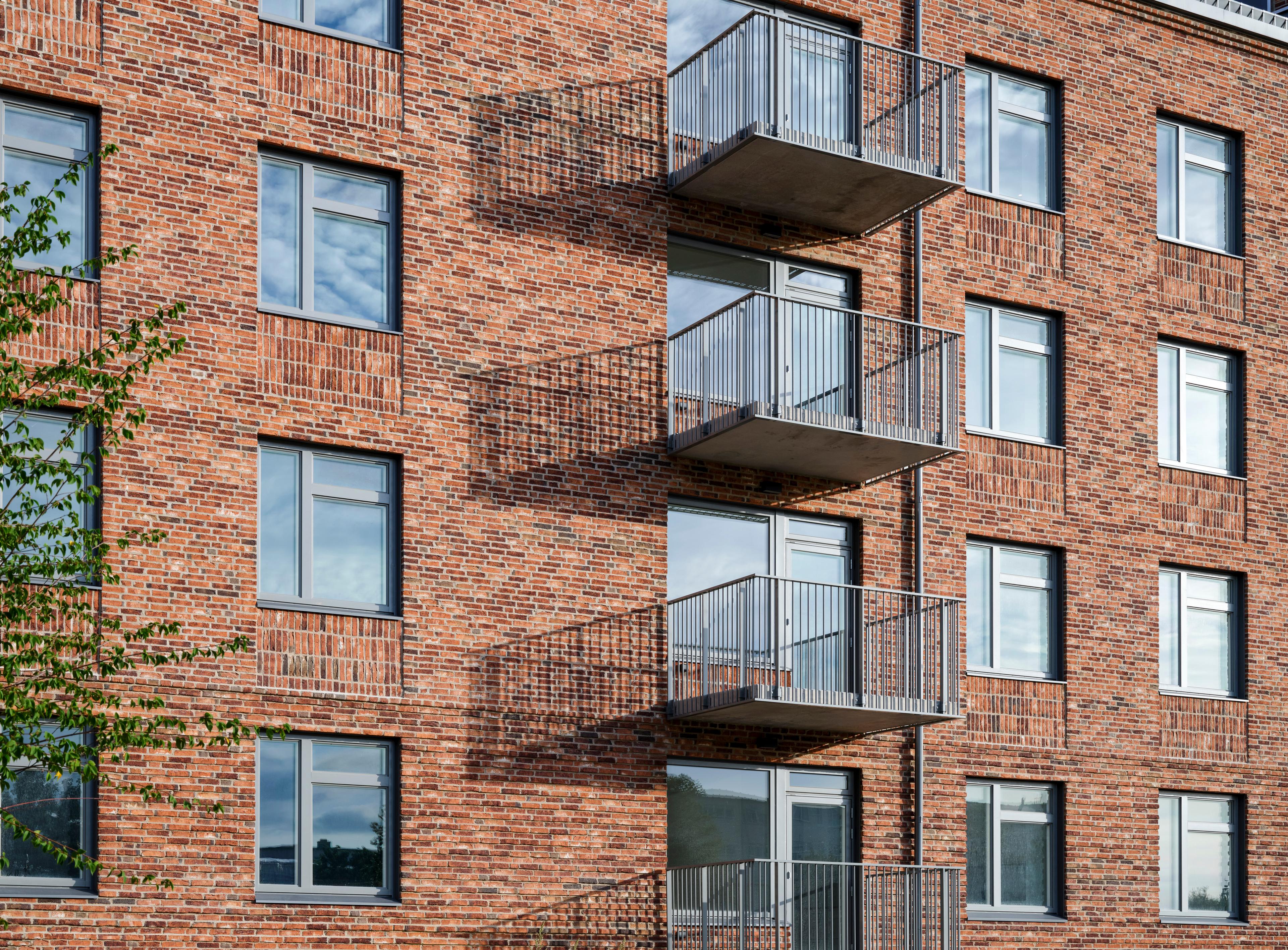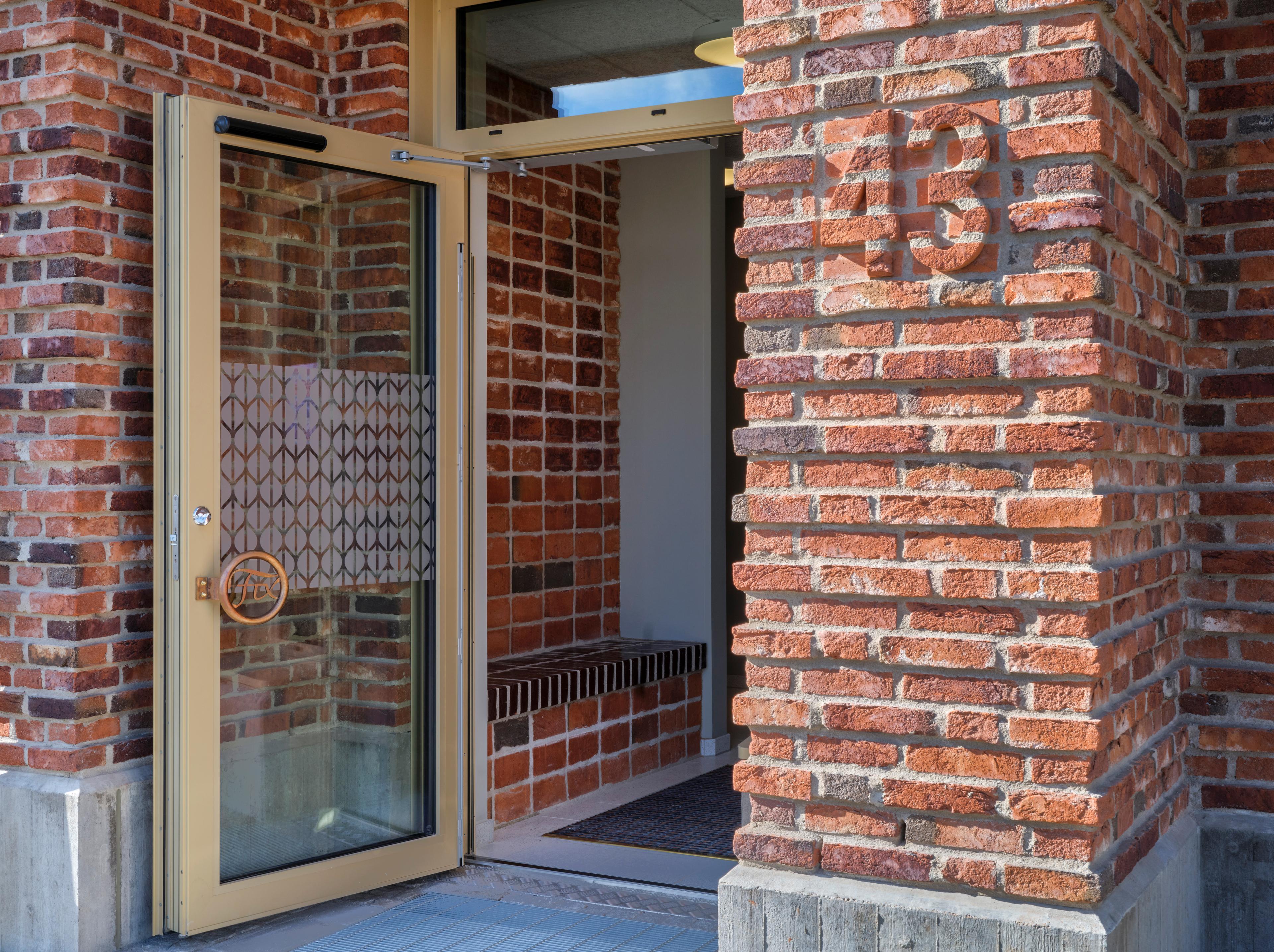 Mycket omsorg har lagts vid tegelfasaderna som är murade med det rustika och handslagna teglet Red Shade. Detaljer som fönsterbröstningar murade i stapelskift, blindfönster med avvikande fog och en sockelvåning som möter gata med reliefmurning i utdragna skift är några exempel. Invändigt har lägenheterna extra hög rumshöjd med platsbyggd förvaring.
