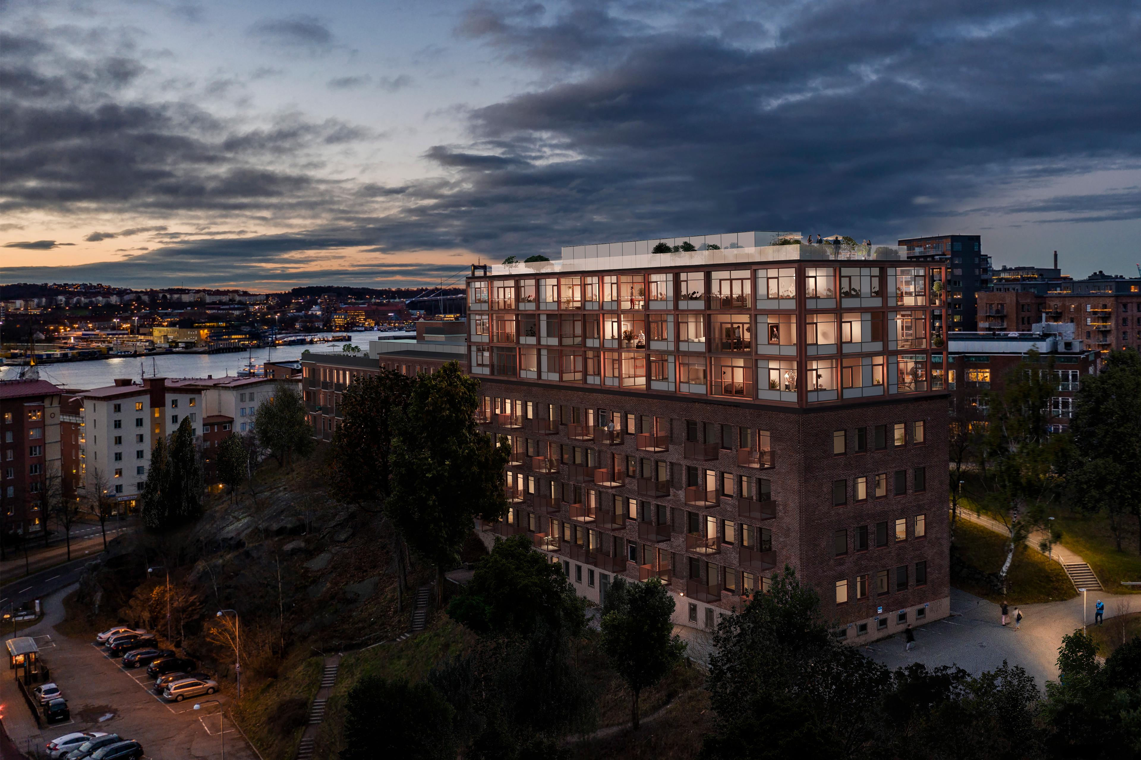 Vinst i parallellt uppdrag för om- och påbyggnad av kontor till bostäder på Hisingen i Göteborg. Den befintliga byggnadens fasad och takfot bevaras men kompletteras med nya balkonger. Påbyggnadens arkitektur har sammhörighet med den befintliga byggnadens struktur och kulör men uttrycket är både lättare och öppnare. Det ger möjlighet till andra planlösningar i de tre översta våningarna. Påbyggnaden är en träkonstruktion med fasad av plåt för att inte få för hög belastning på den befintliga byggnaden.