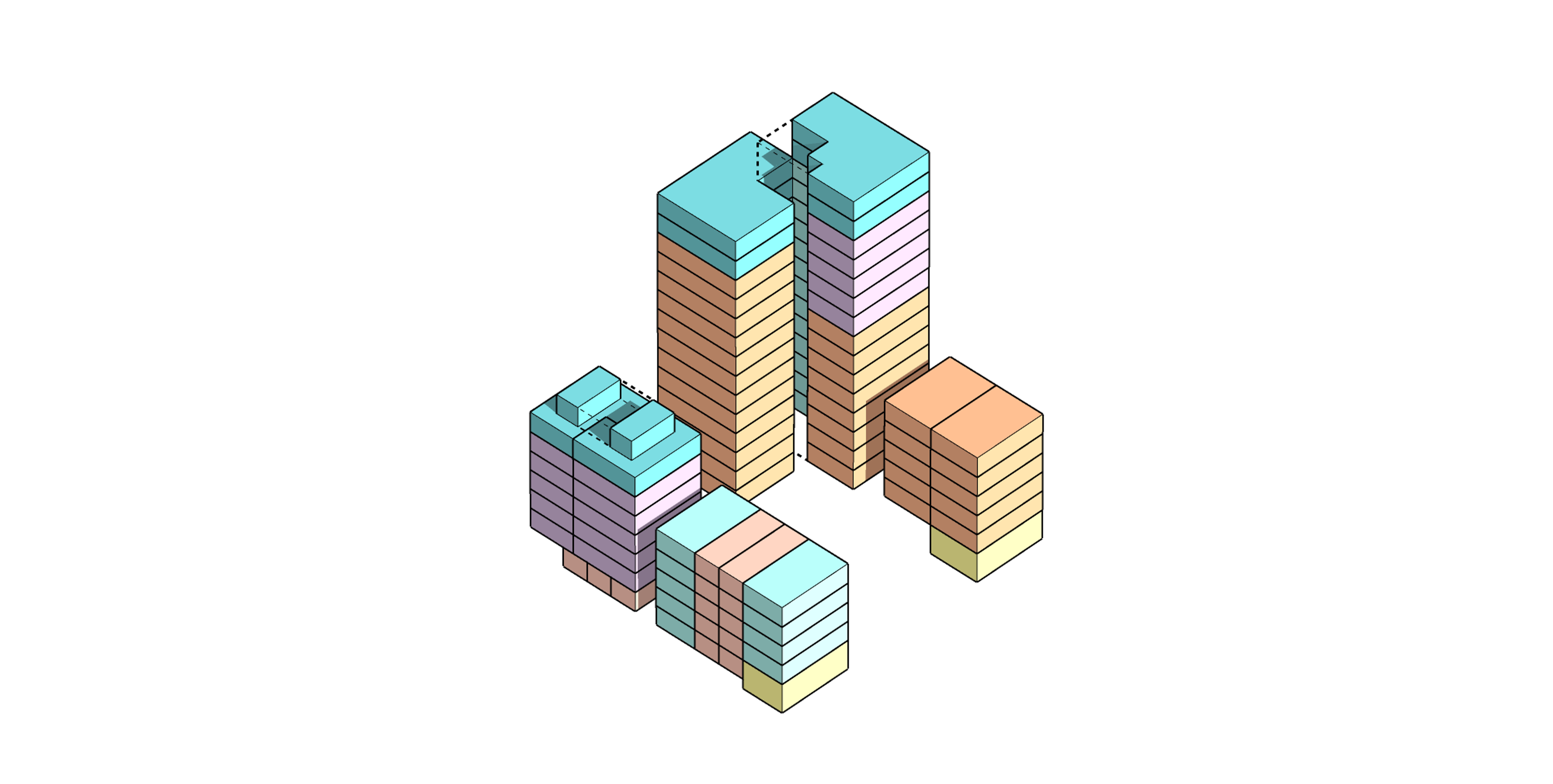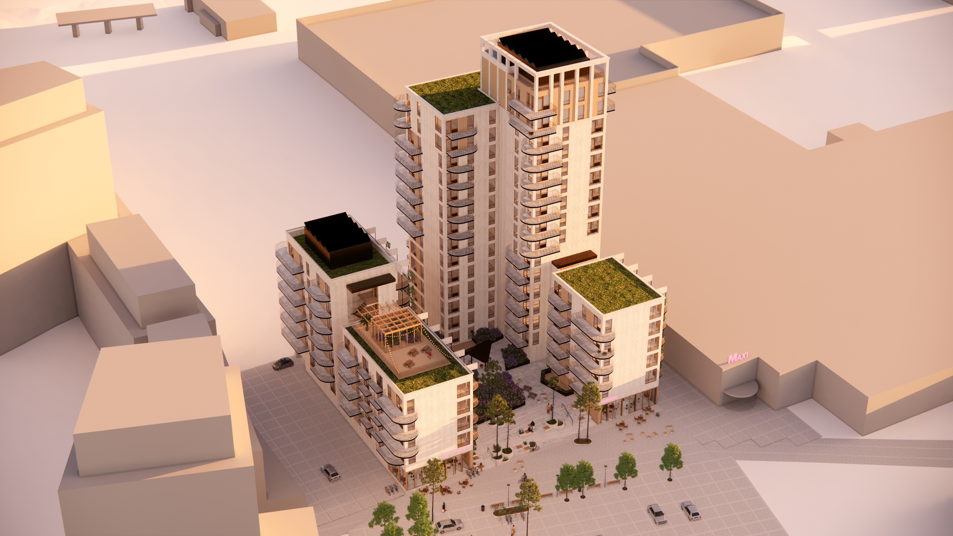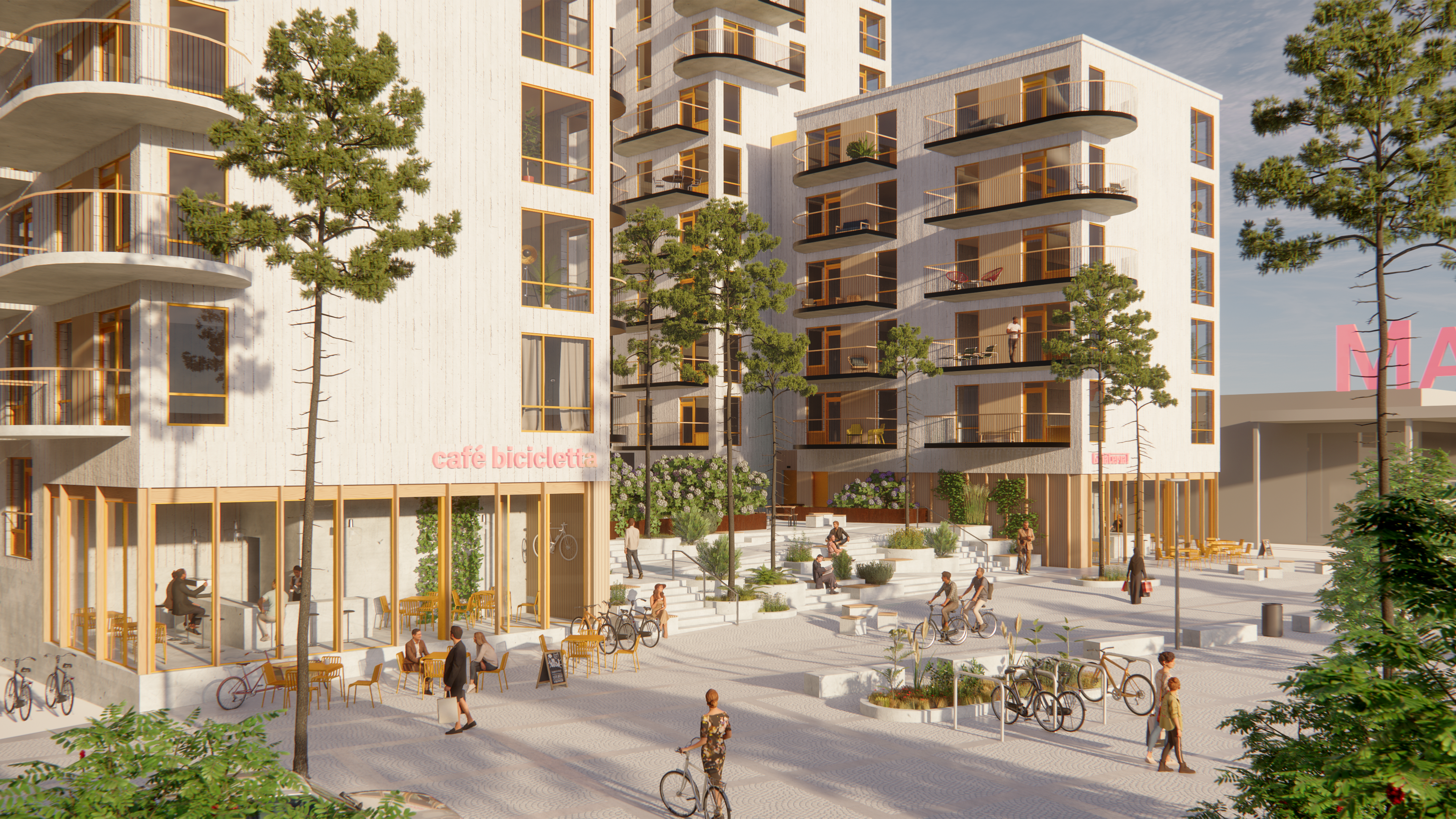 Bebyggelsen består av ett högre hus i norr, som fungerar som en tydlig markör och skapar en rygg mot parkeringen, samt lägre lamellhus som ansluter till torget. Byggnadernas volymer är uppdelade för att skapa en dynamisk siluett och en trivsam småstadskänsla. Bottenvåningarna rymmer verksamheter som cykelcafé och kvarterskrog, medan publika sittrappor och upphöjda gårdar skapar naturliga mötesplatser.