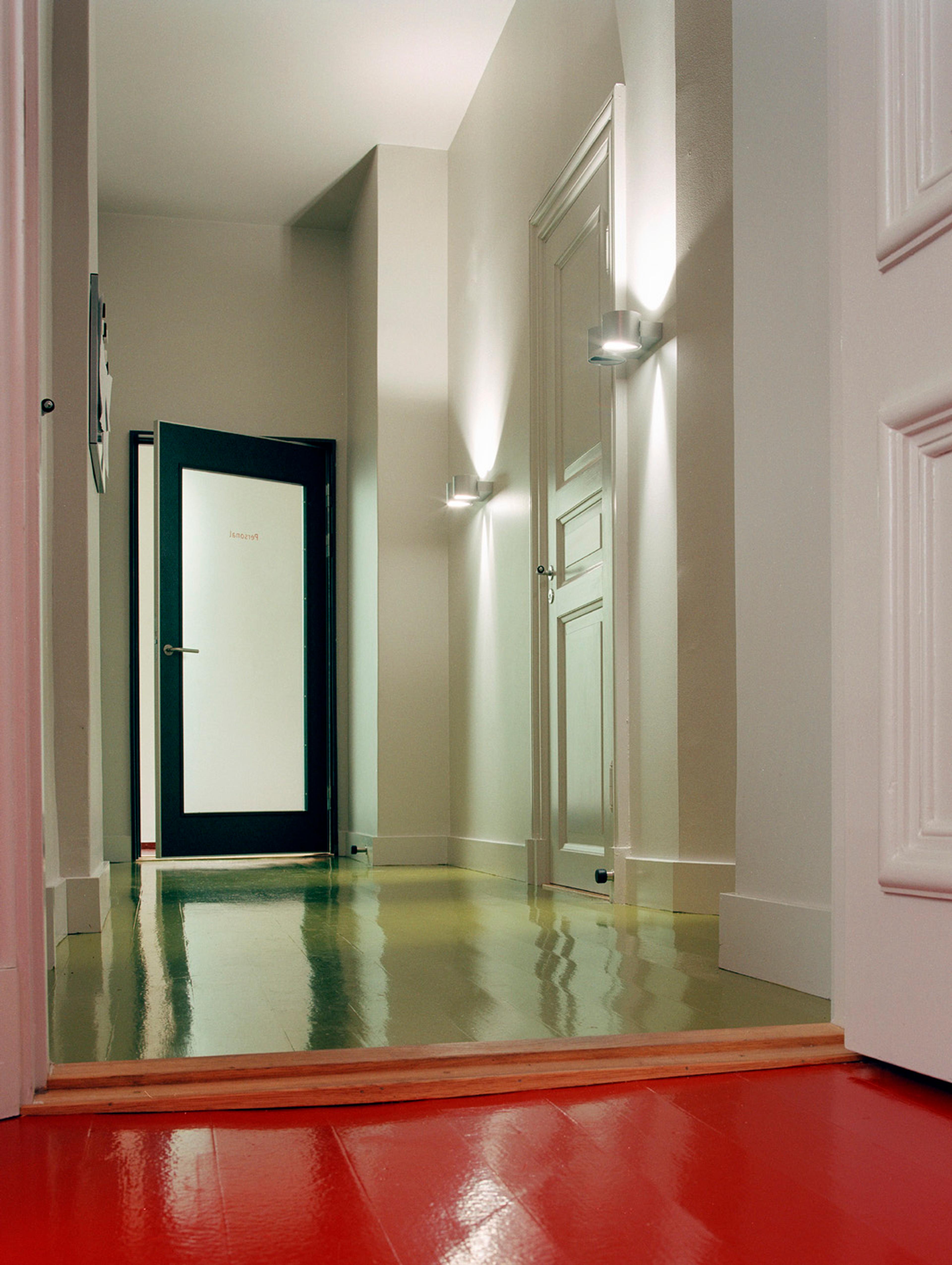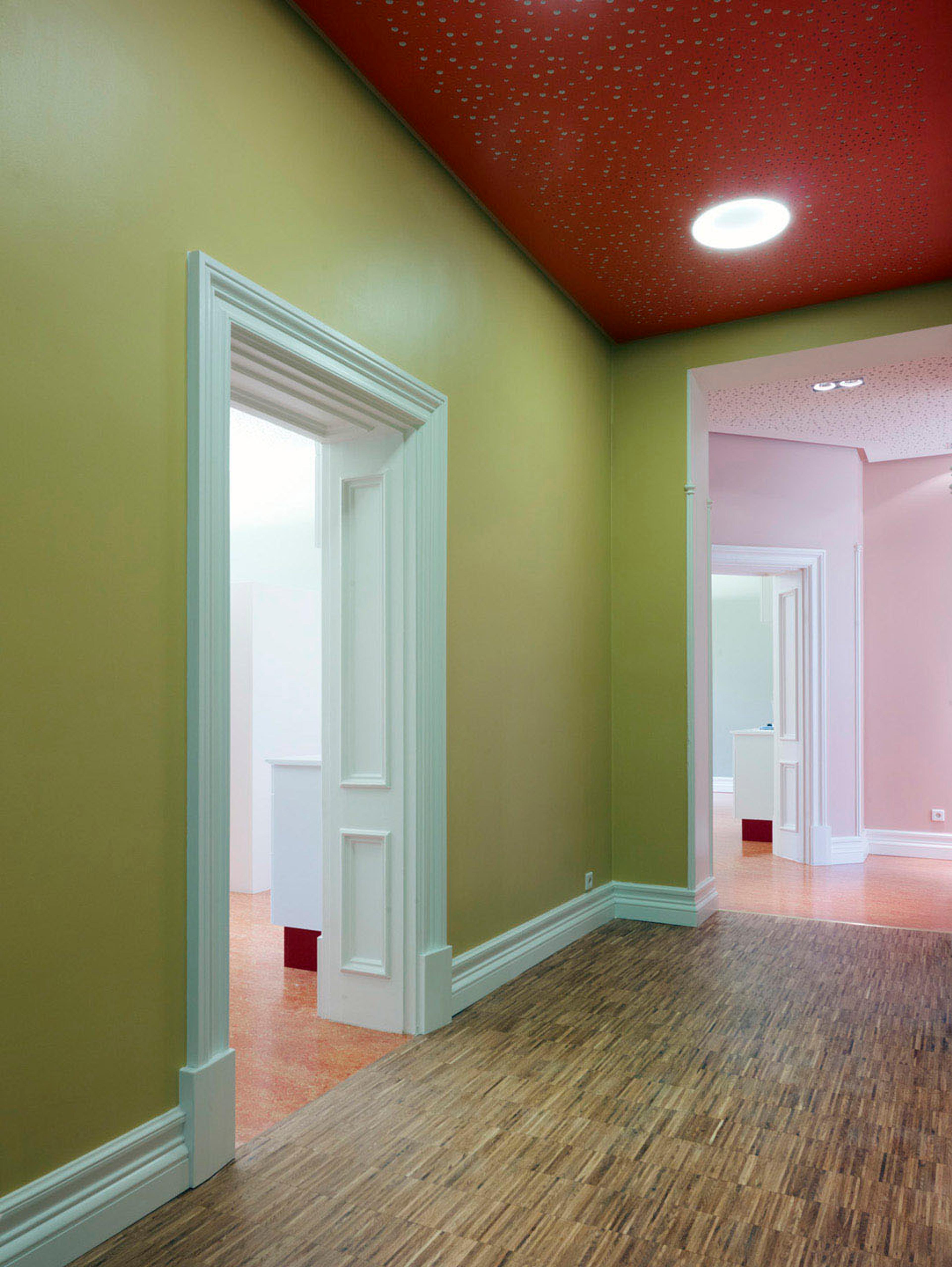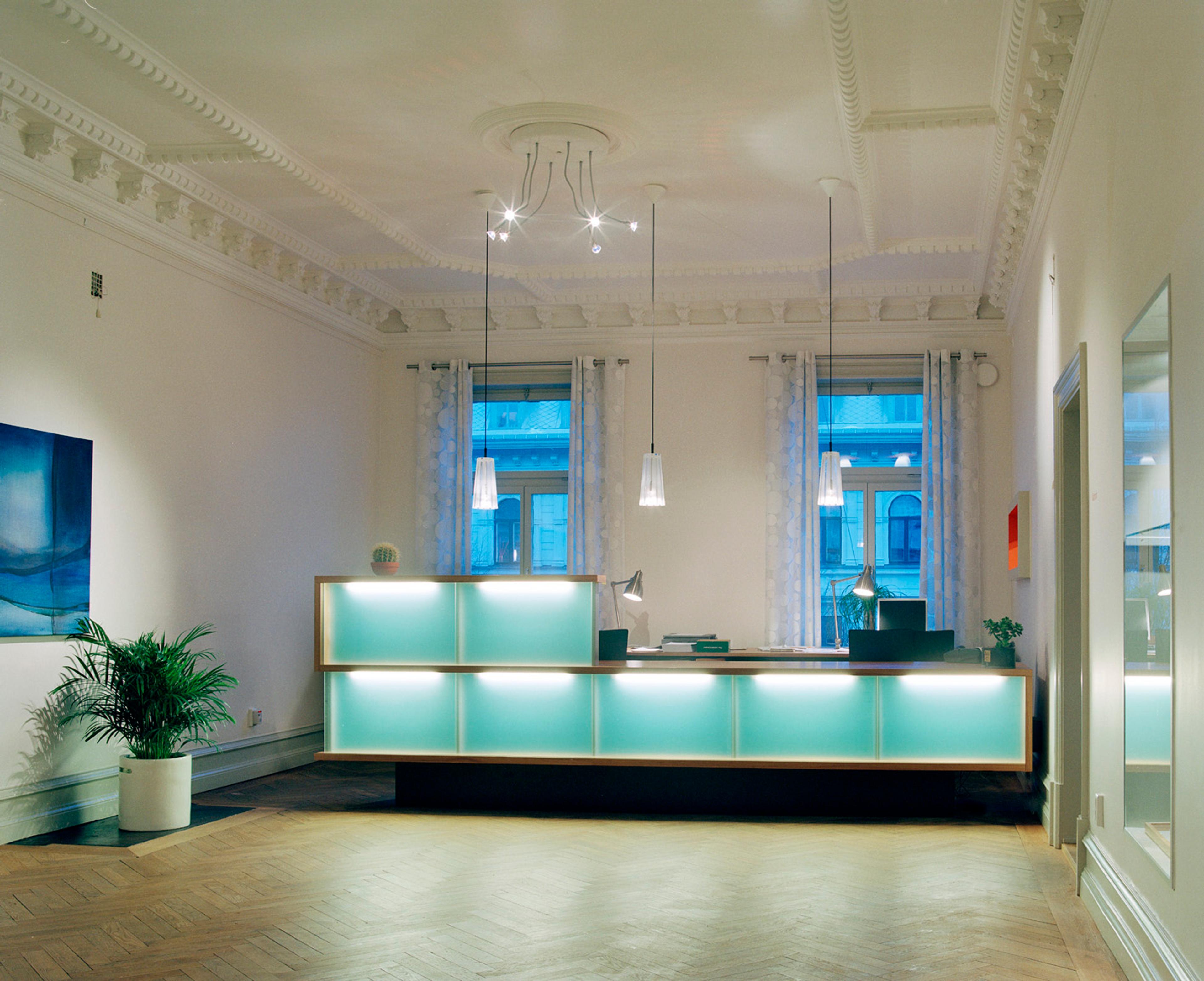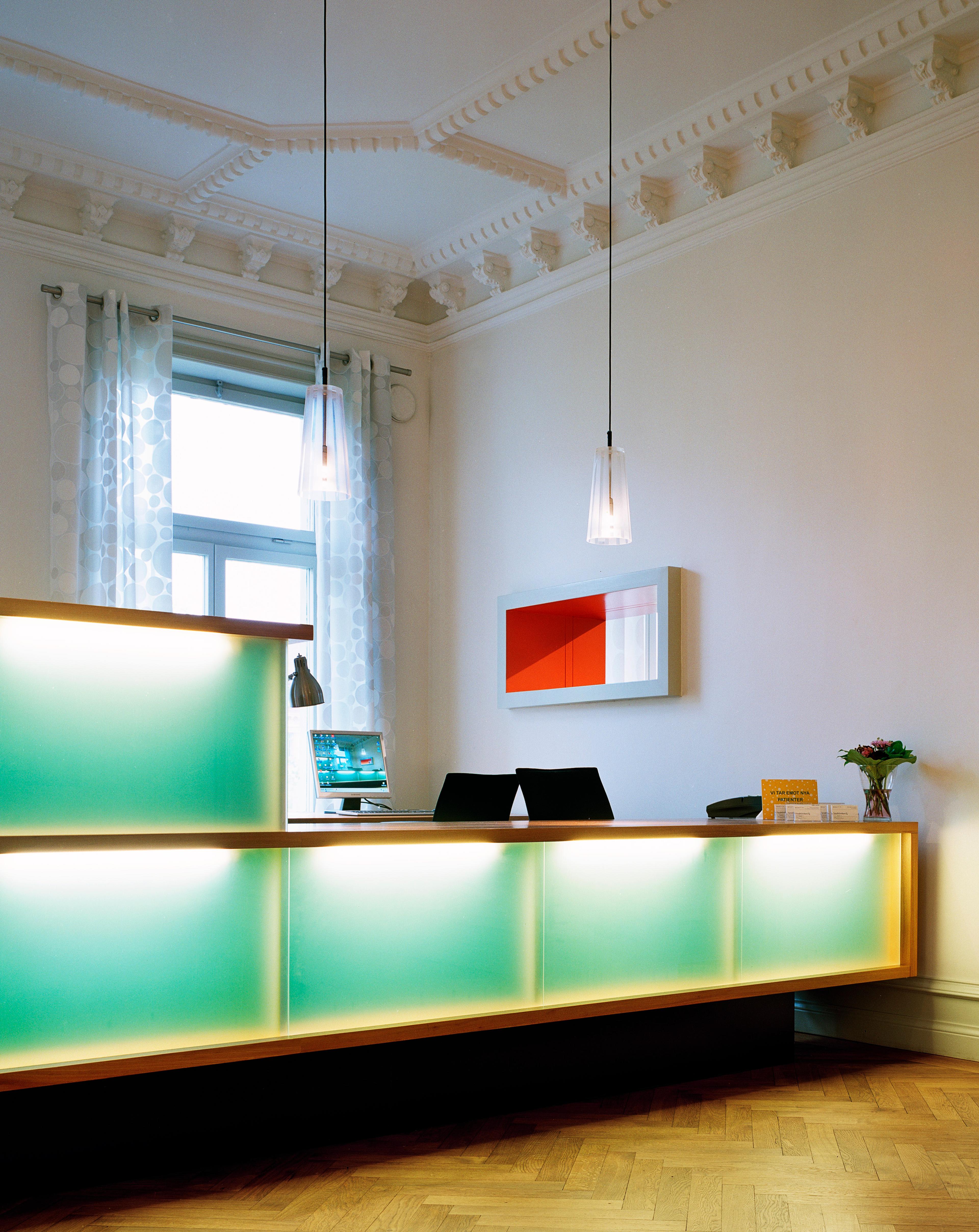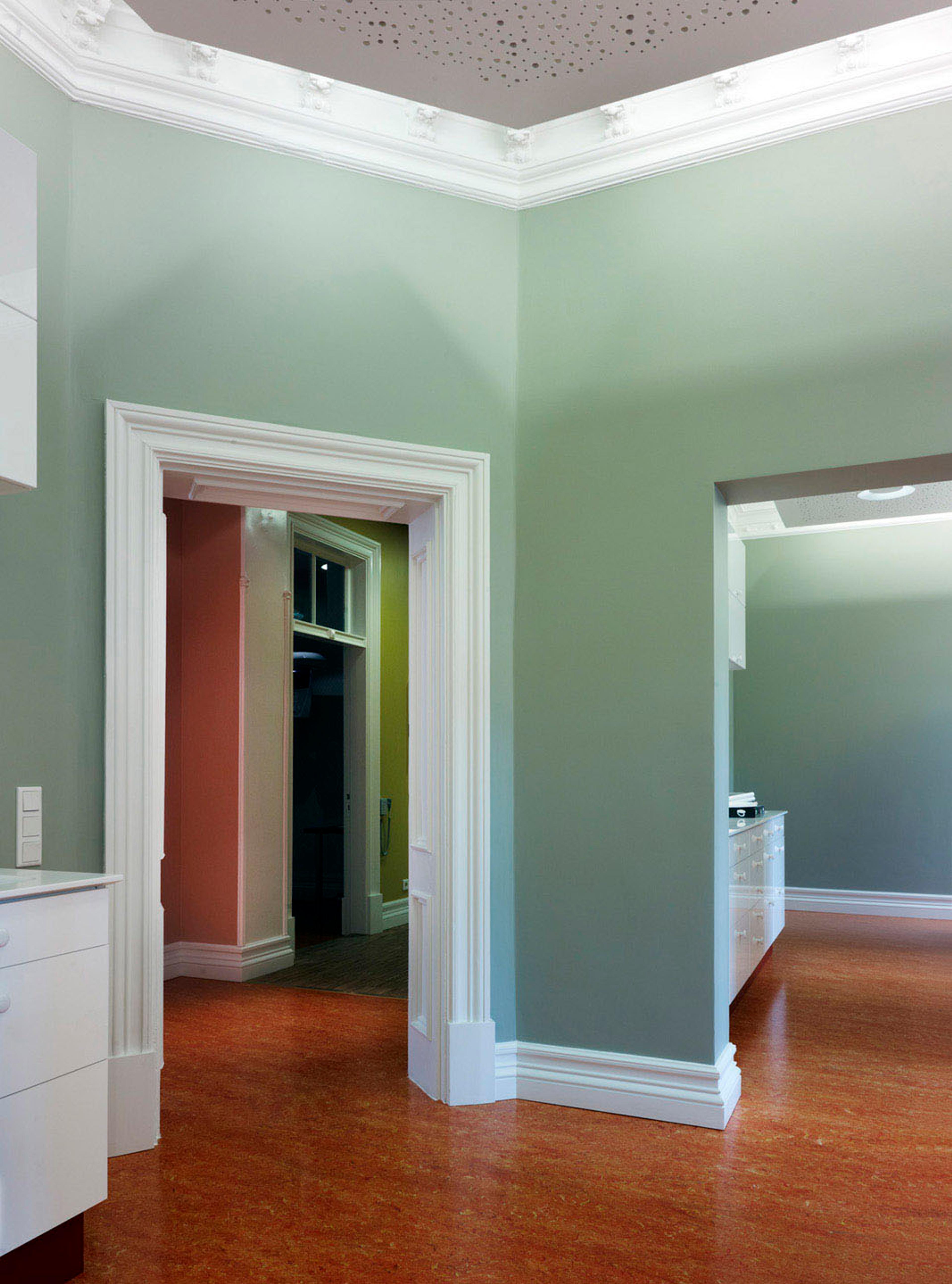 En bärande idé för inredningen var färgstarka golv. Den ekparkett som fanns kvar är slipad och behandlad med olja. Plankgolv i personaldelarna är målade med täckfärg. Behandlingsutrymmena har mörkbrunt linoleumgolv. Receptionsdisk och behandlingsenheter är specialdesignade för projektet. Skärmväggar likaså, de avdelar de olika behandlingsrummen och har två syften. Det ena är en effektiv plats för tandläkare och sköterska där allt som behövs finns nära, det andra att patienten inte ska känna sig instängd och trots storleken uppleva ett större rum. En tandläkarmottagning innebär många installationer och i behandlingsutrymmena krävdes undertak. Undertaken avslutas innan vägg för att stuckaturen ska vara synlig även i dessa rum.