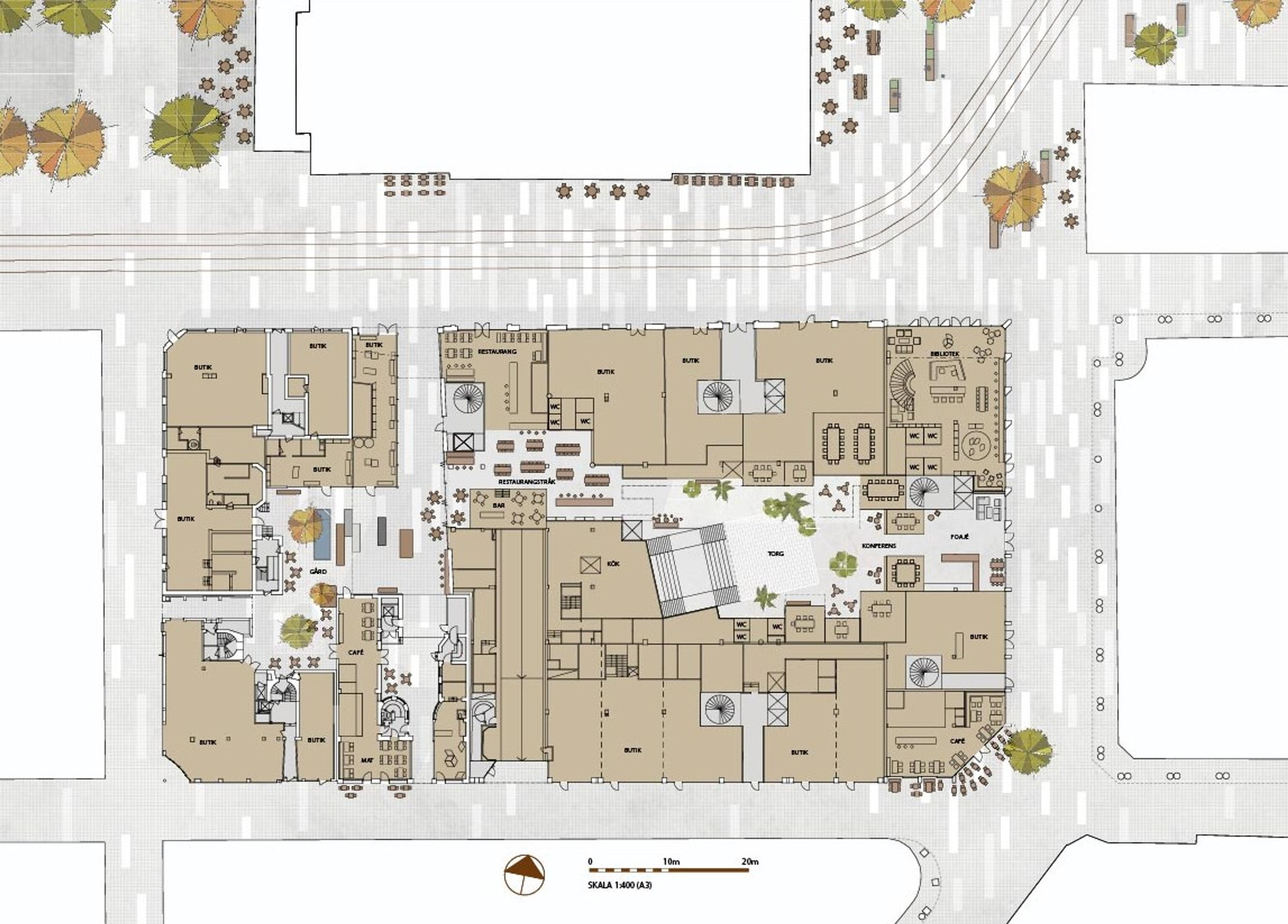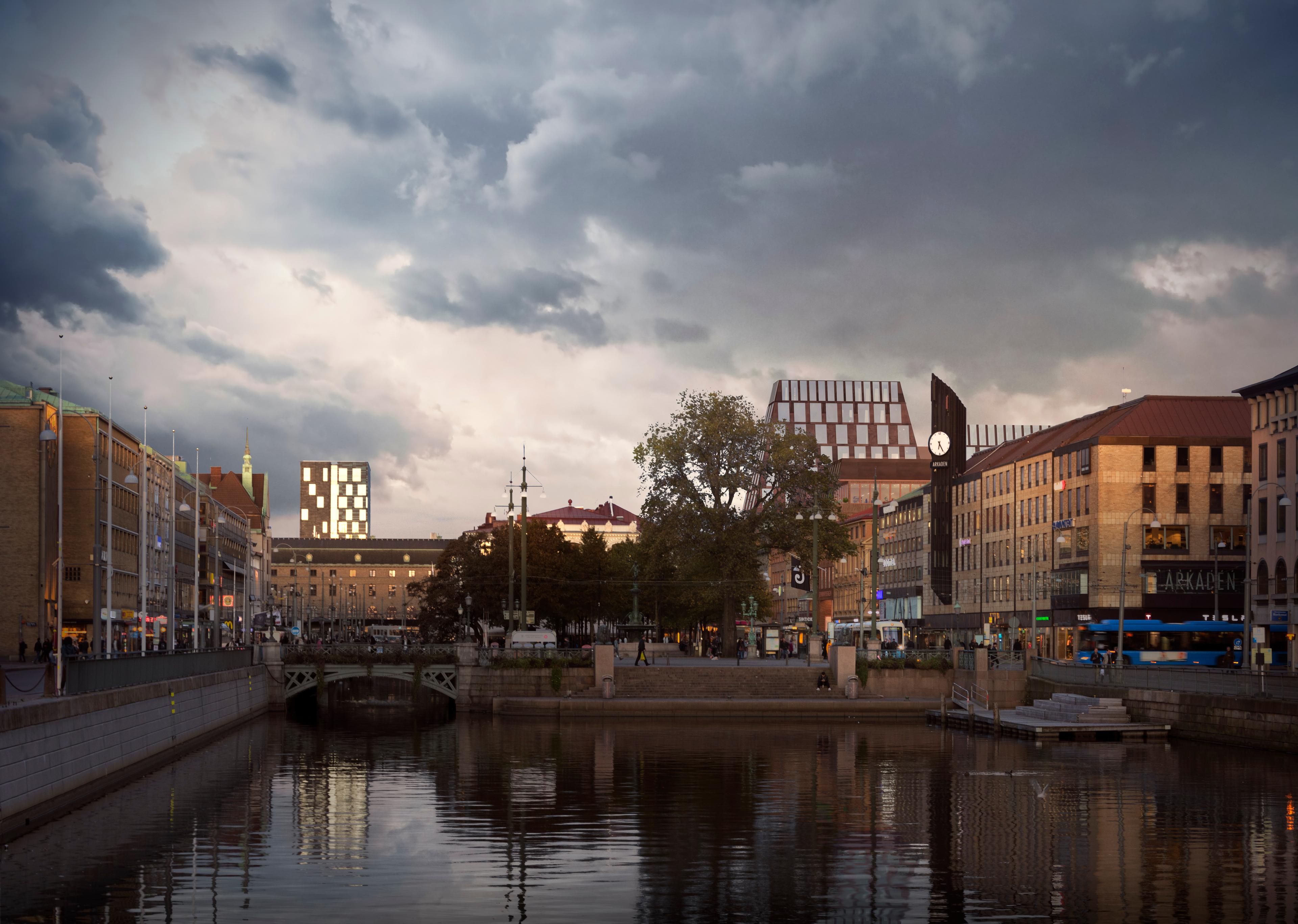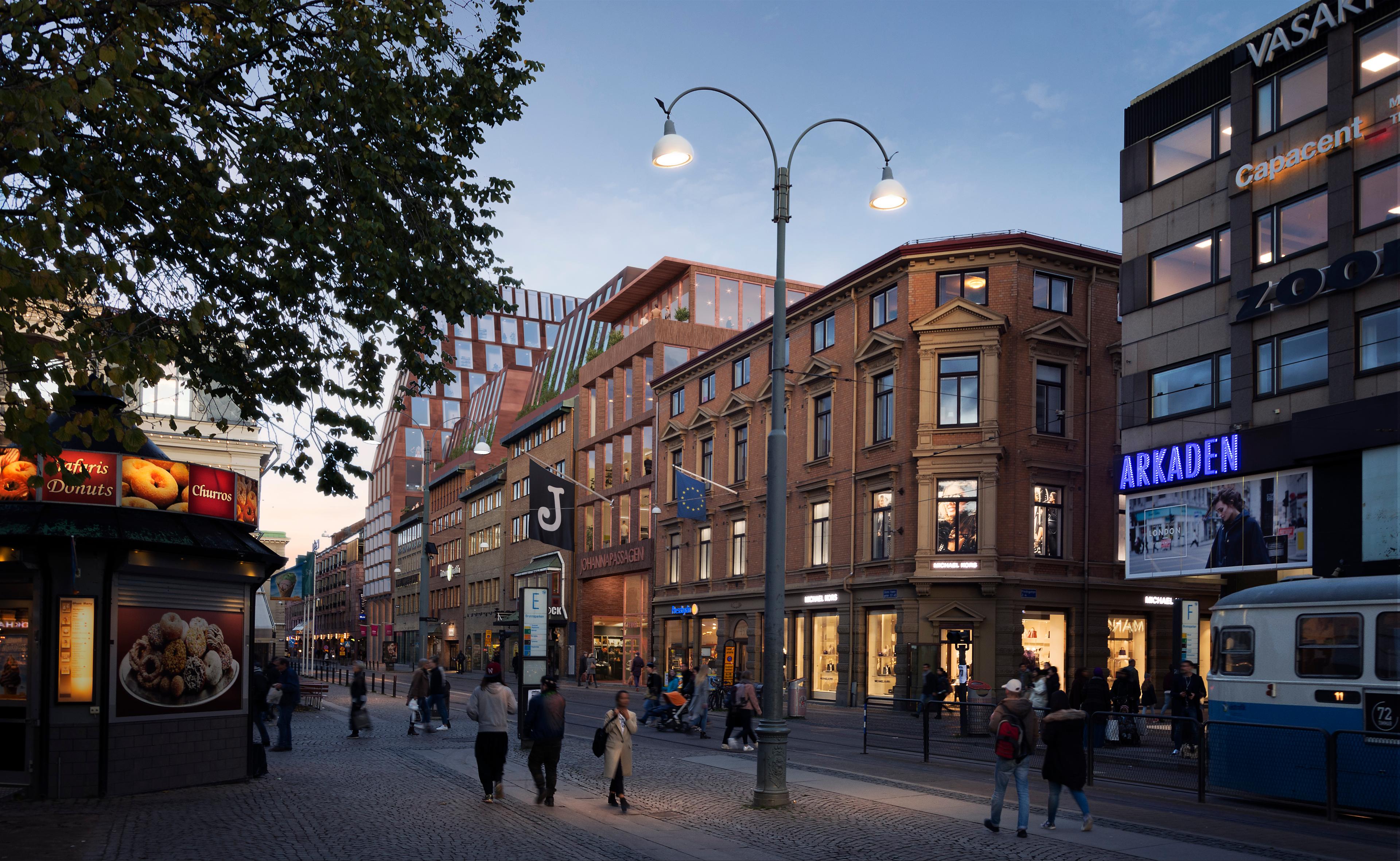 Parallellt uppdrag om utveckling av Fredstan i centrala Göteborg, "Kvarteret Johanna", med kontor och handel. På 1600-talet låg en av stadens entréer här, Drottningporten. Sedan 1800-talet har Hotellplatsen för många varit första mötet med staden och så även idag. Förslaget syftar till att förstärka den här entrén och mötet med staden. Vi ville återskapa karaktären av torg och markera platsen med en högre byggnad som landmärke samt bredda Östra larmgatan för att öppna upp stråket in i staden. För att bibehålla känslan av gatornas nuvarande skala har påbyggnad av befintliga byggnader utformats som branta tak som följer fasadindelningens rytm.
