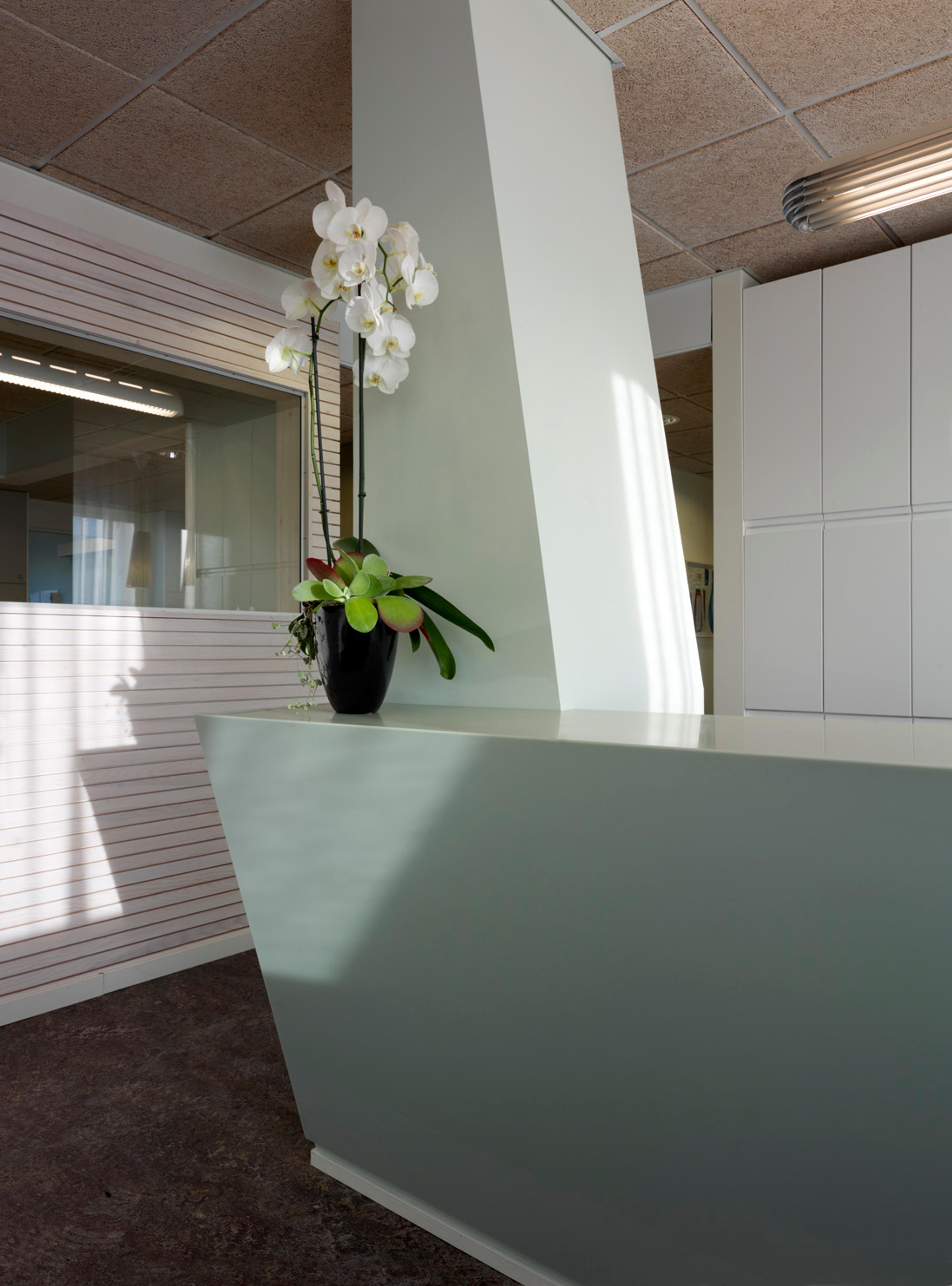 Den omfattande ombyggnaden av fastigheten vid Wieselgrensplatsen skapade en unik möjlighet för Tandkliniken Pärlan att utvidga sina lokaler. De befintliga utrymmena var inte bara trånga och mörka utan även utmanande att arbeta i. Eftersom takhöjden var begränsad, fokuserade projektet på att skapa effektiv logistik och säkerställa att alla delar av verksamheten fick tillgång till naturligt ljus. En betydande förbättring inkluderade en träpanel-klädd steril med ett 4,4 meter brett fönster mot receptionen och fasaden. Totalt sett utökades verksamheten med sex behandlingsstolar.