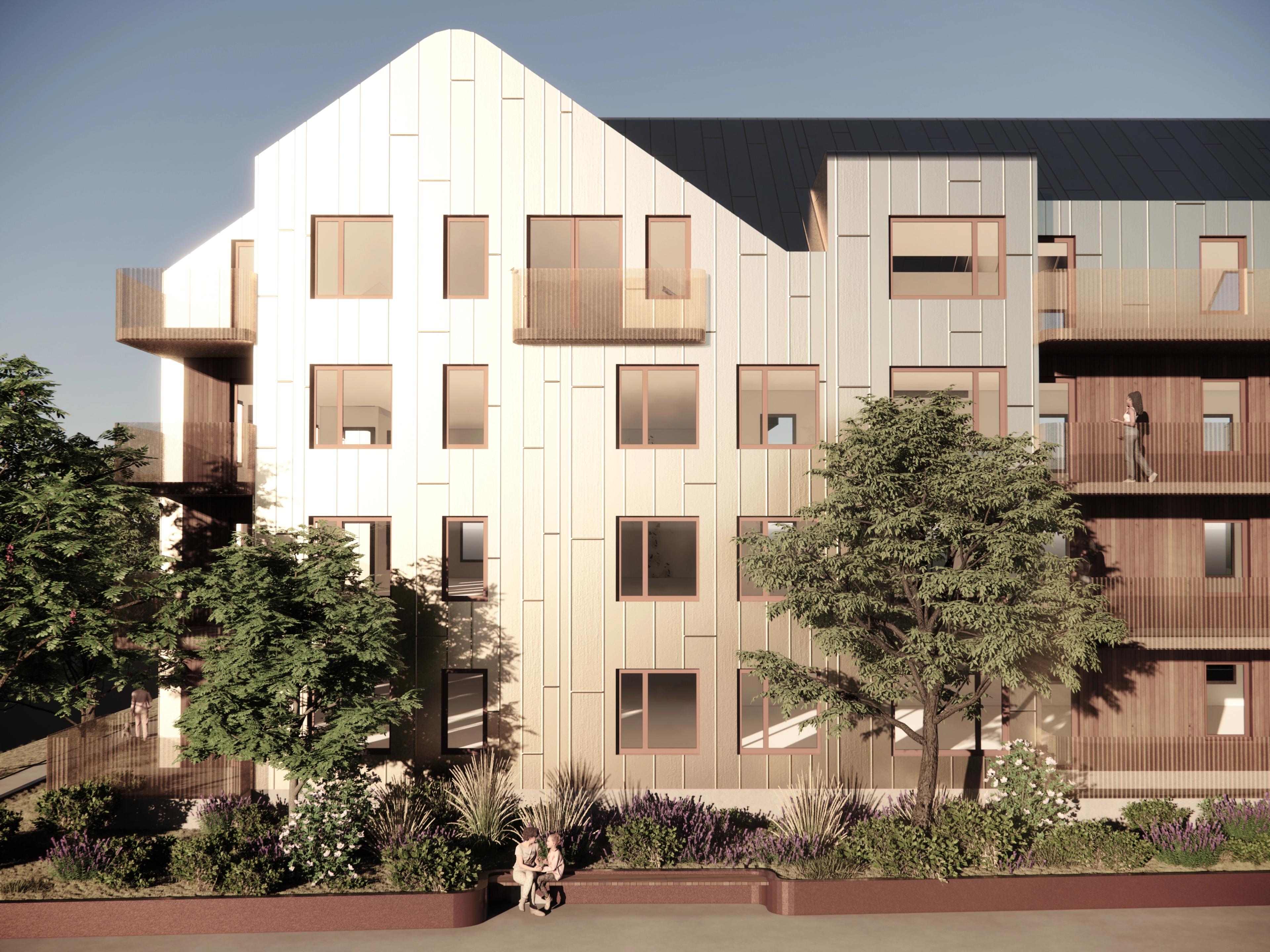 Fasaden är i huvudsak av tegl med inslag av trä och falsad plåt. En målsättning har varit att skapa variation i fasaderna med hjälp av burspråk, gavlar, balkonger och terrasser. Vi vägkorsningen bidar de två byggnaderna en mindre platsbildning med entré in till gården.