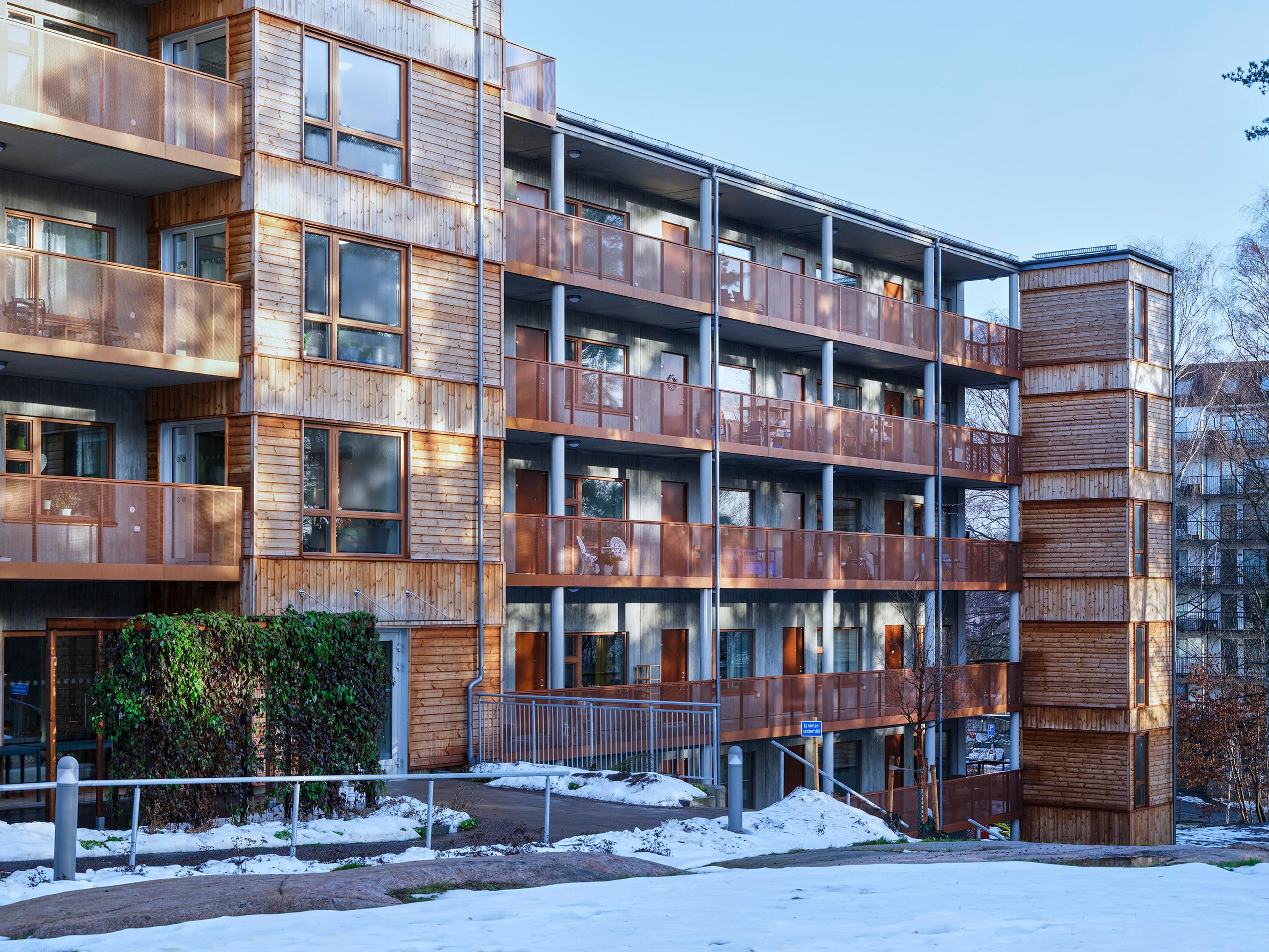Fasaden är indelad i ett rutsystem med släta målade partier som ramar in brädgjutna omålade ytor med fönster. Effekten blir att betongelementens skarvar "försvinner" och fasaden upplevs mer sammanhängande. Fönsterkarmar och räcken har en varmt brunröd träton som samspelar med tallarnas stammar. Trapphusens träpanel kommer med tiden att bli silvergrå.