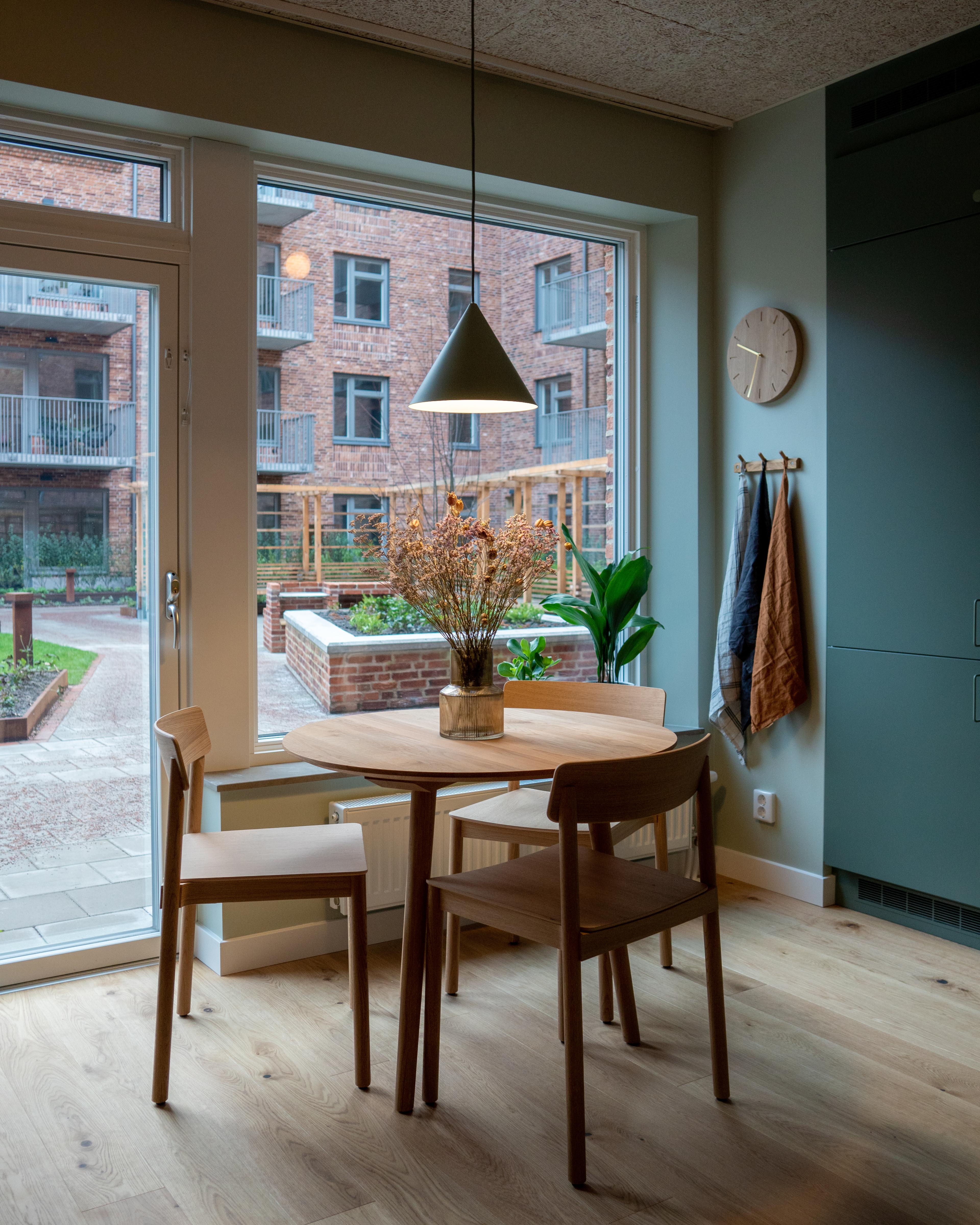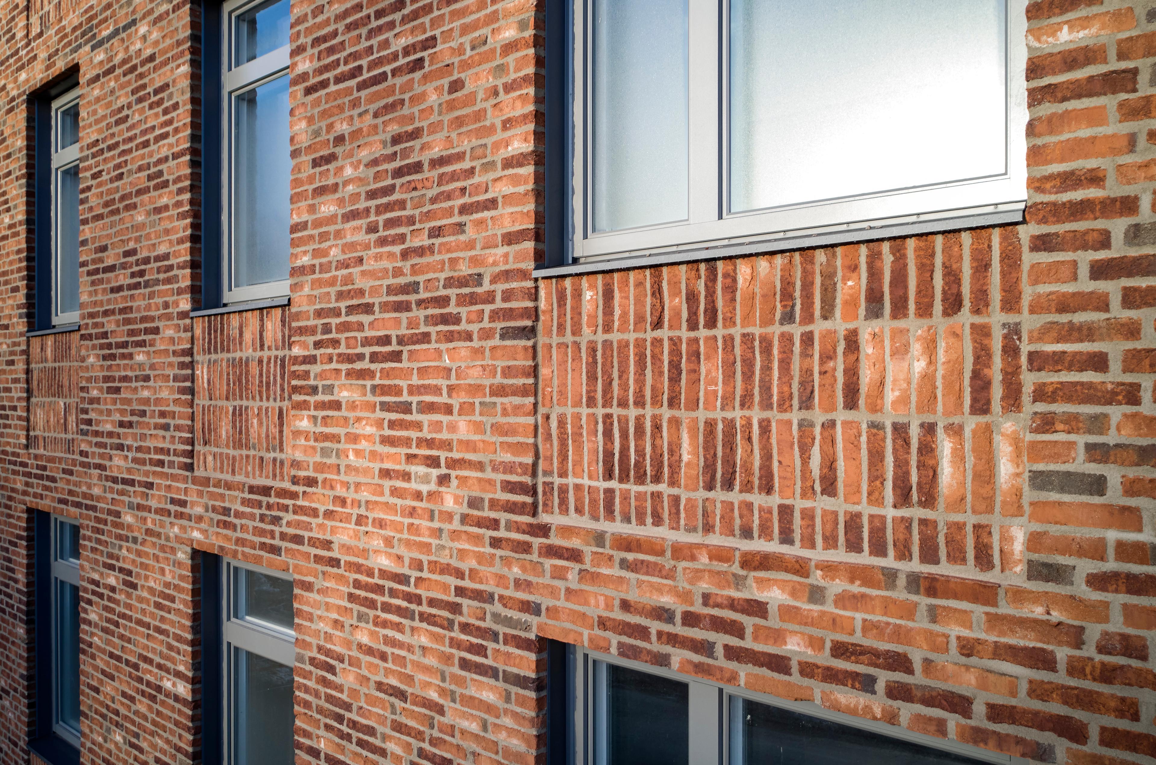 Mycket omsorg har lagts vid tegelfasaderna som är murade med det rustika och handslagna teglet Red Shade. Detaljer som fönsterbröstningar murade i stapelskift, blindfönster med avvikande fog och en sockelvåning som möter gata med reliefmurning i utdragna skift är några exempel. Invändigt har lägenheterna extra hög rumshöjd med platsbyggd förvaring.