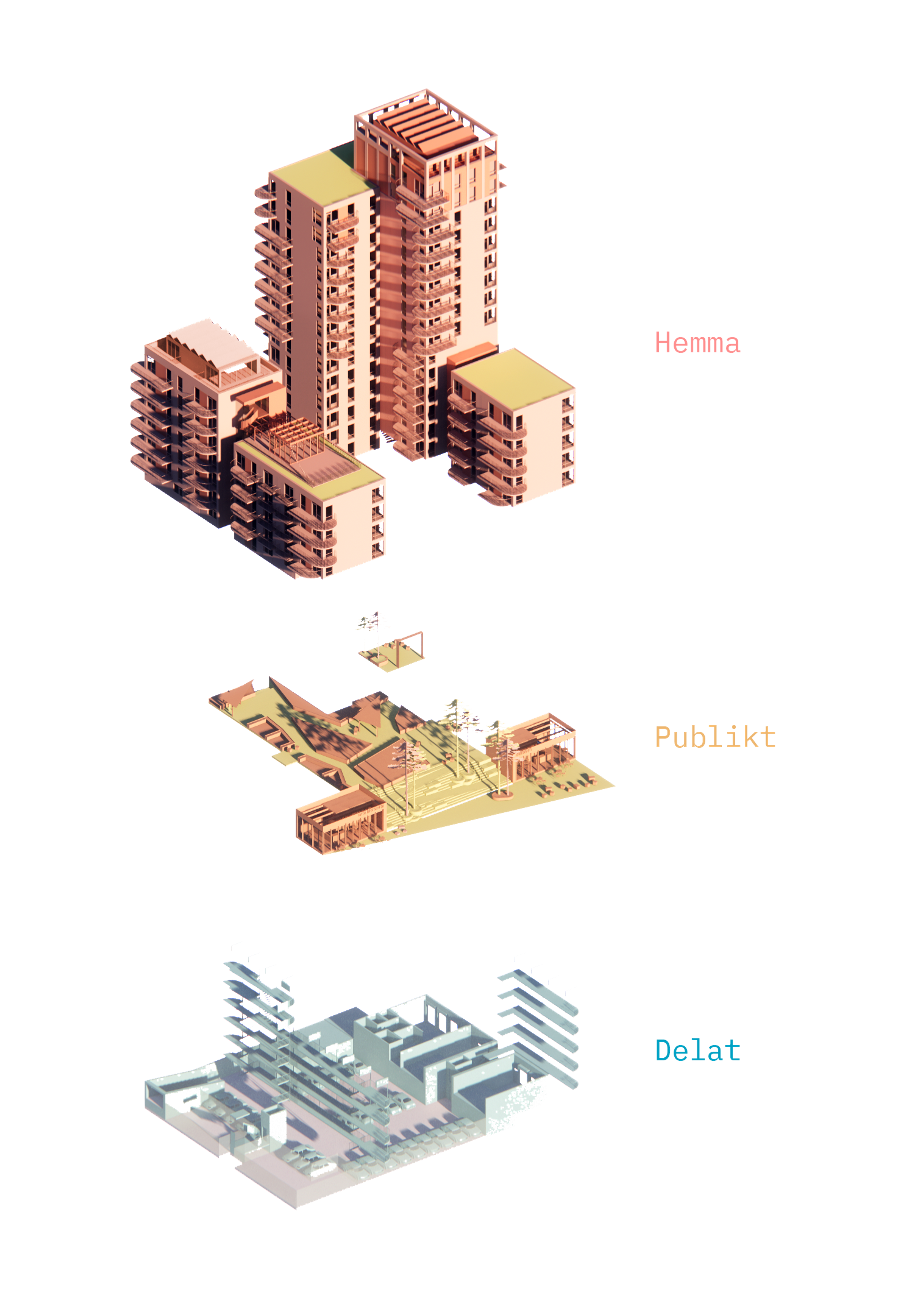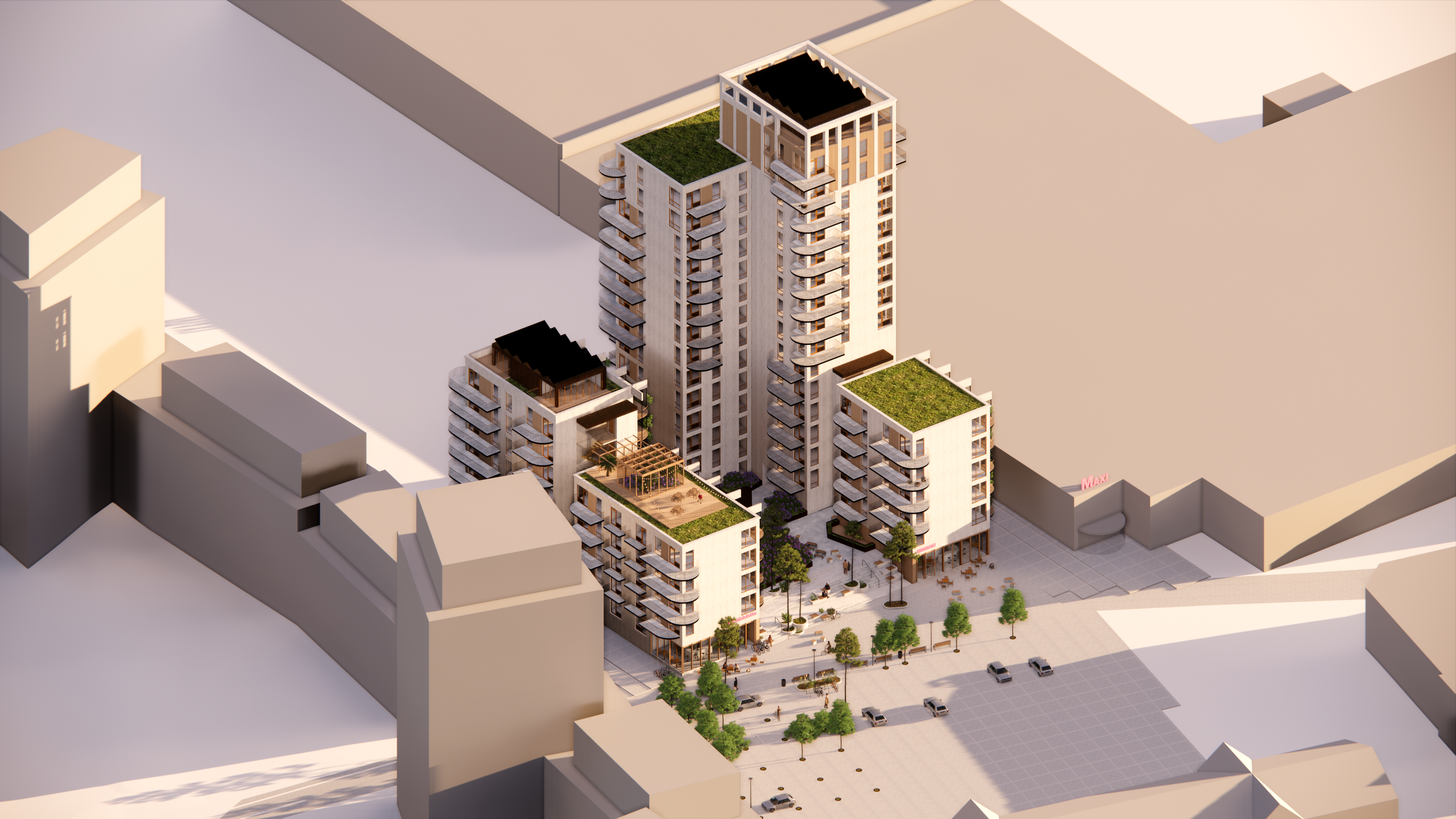 Bebyggelsen består av ett högre hus i norr, som fungerar som en tydlig markör och skapar en rygg mot parkeringen, samt lägre lamellhus som ansluter till torget. Byggnadernas volymer är uppdelade för att skapa en dynamisk siluett och en trivsam småstadskänsla. Bottenvåningarna rymmer verksamheter som cykelcafé och kvarterskrog, medan publika sittrappor och upphöjda gårdar skapar naturliga mötesplatser.