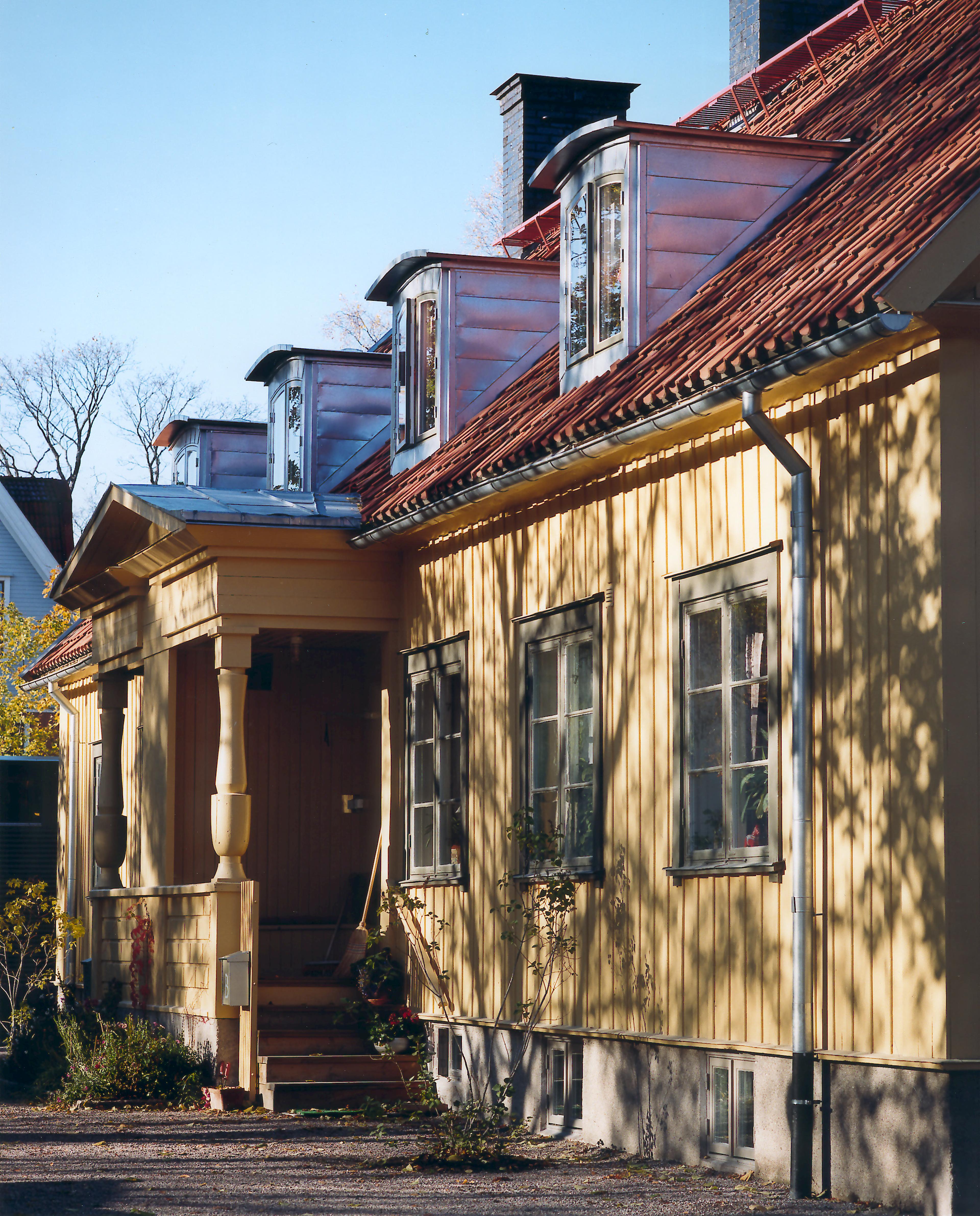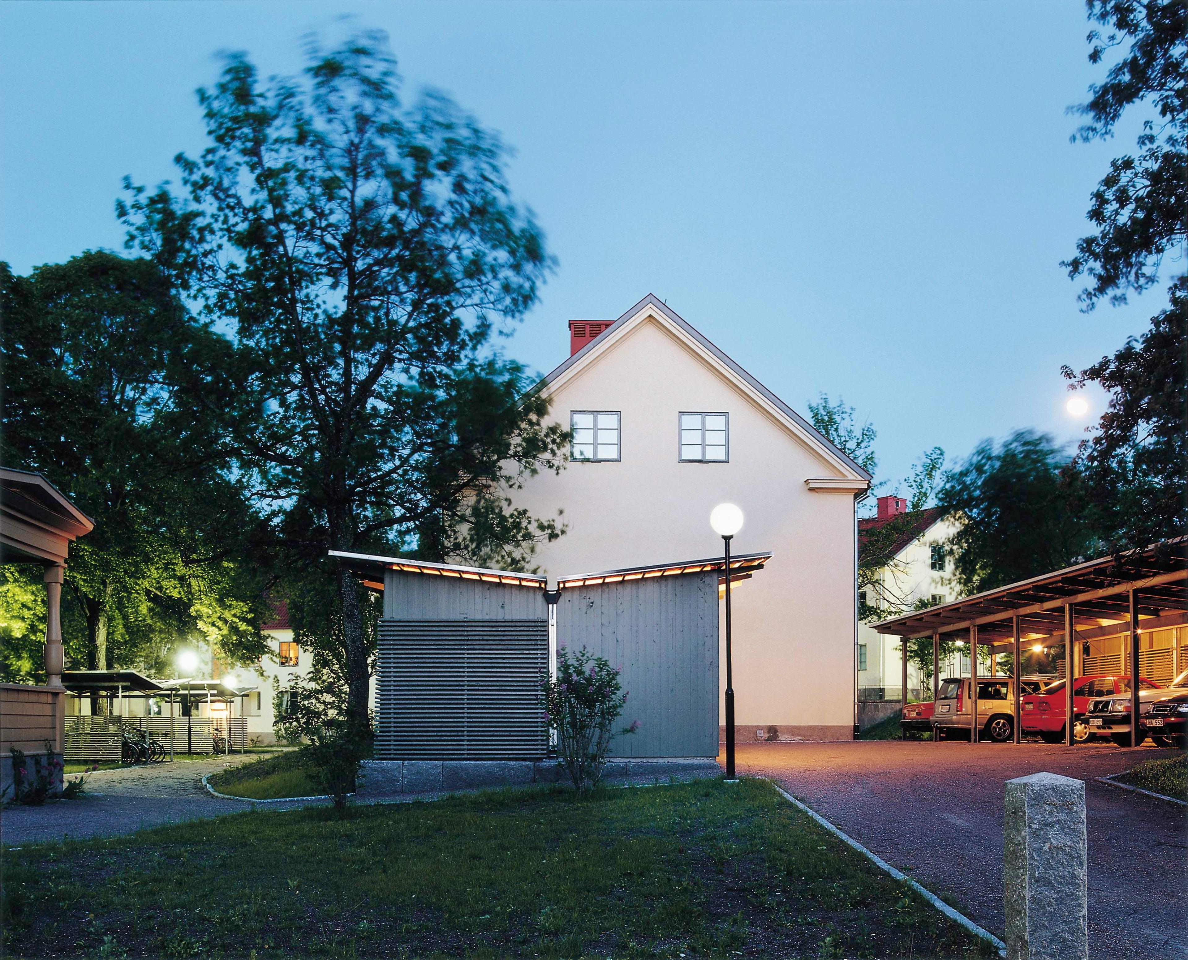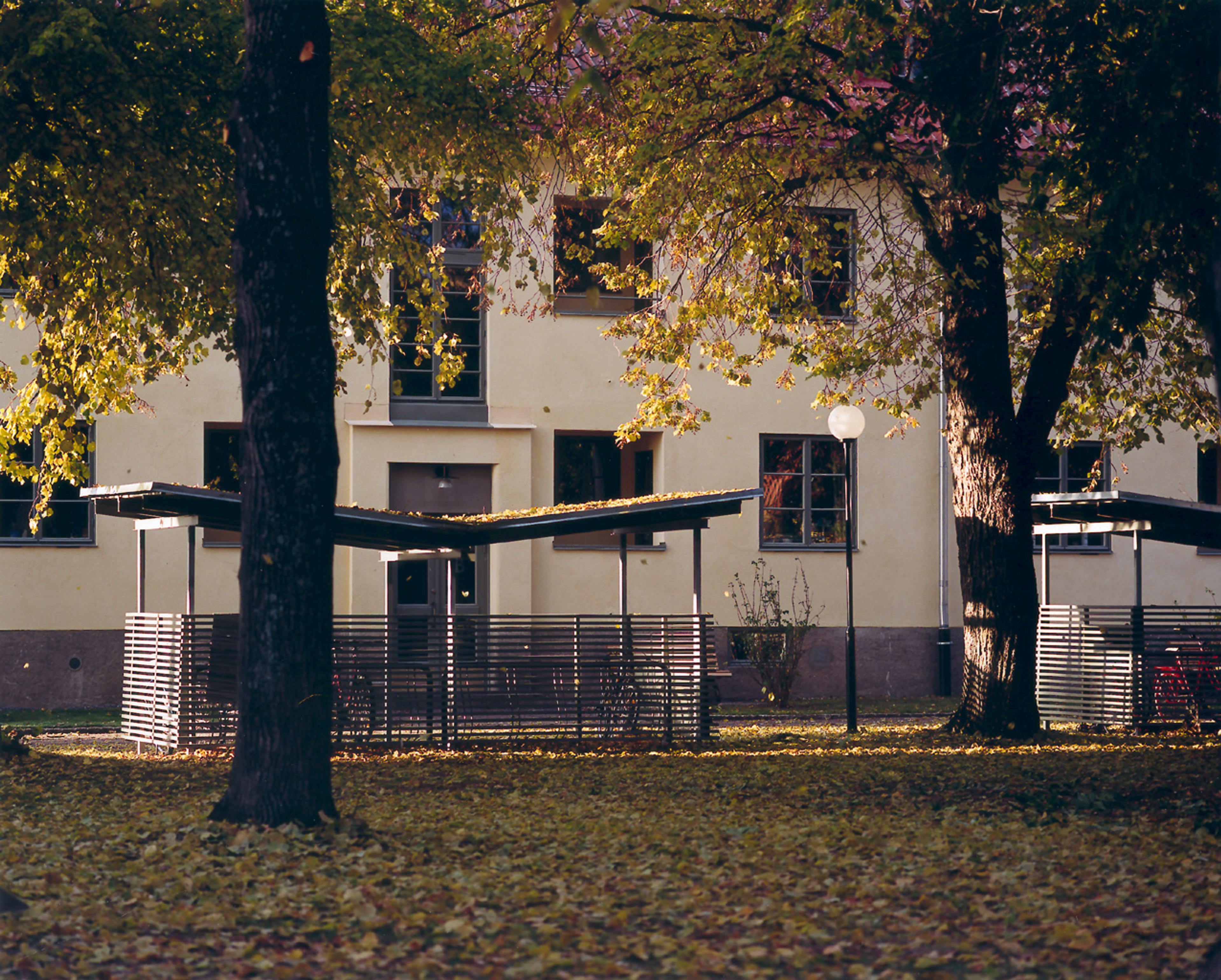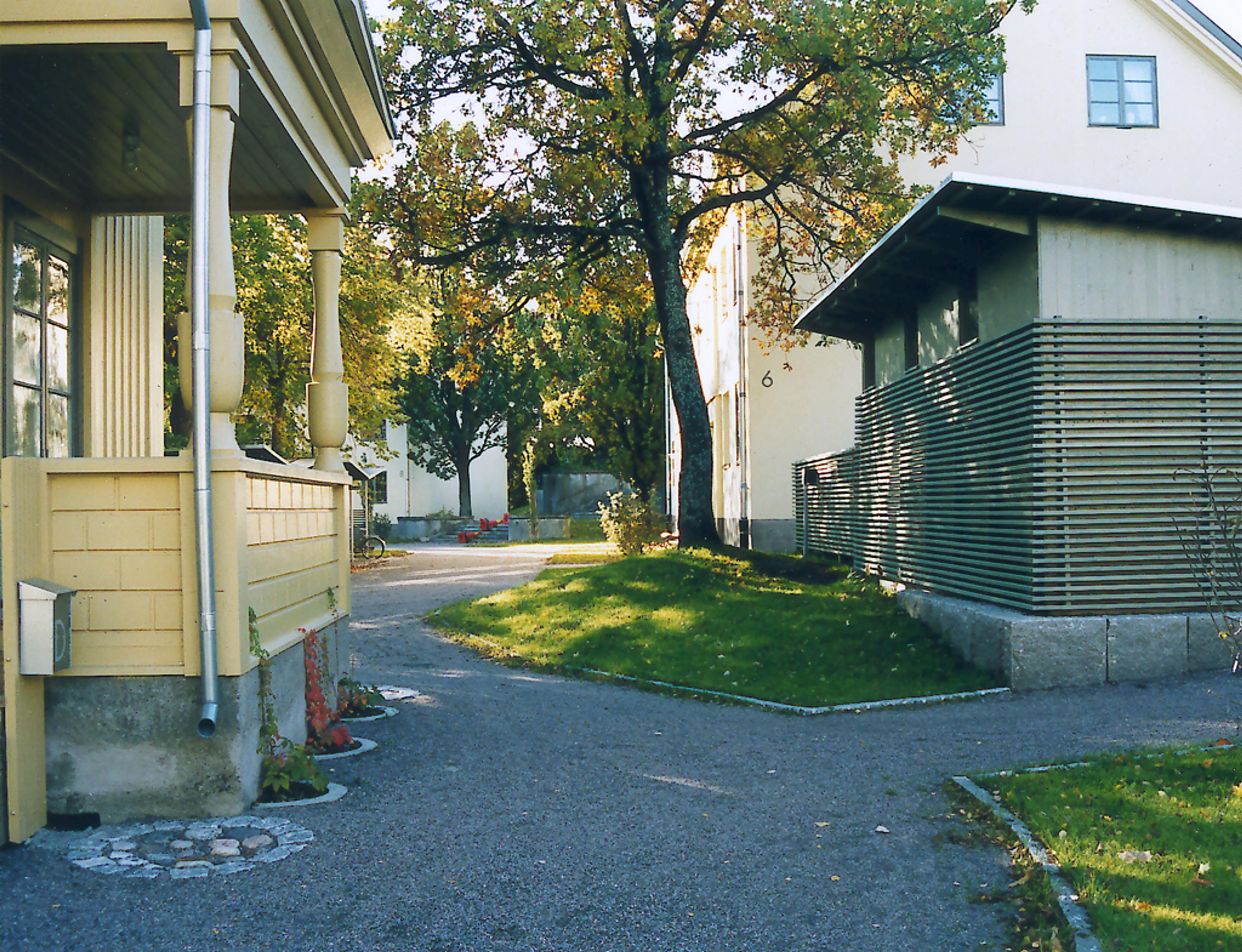 Utöver ombyggnad har nya komplementbyggnader fogats in i miljön så att viktiga siktlinjer behålls. Miljörum, carport och cykelförråd. Byggnaderna tar utgångspunkt i ett gemensamt eget formspråk. Den dovt gröna kulören underordnar sig de äldre byggnadernas varmgula kulör.