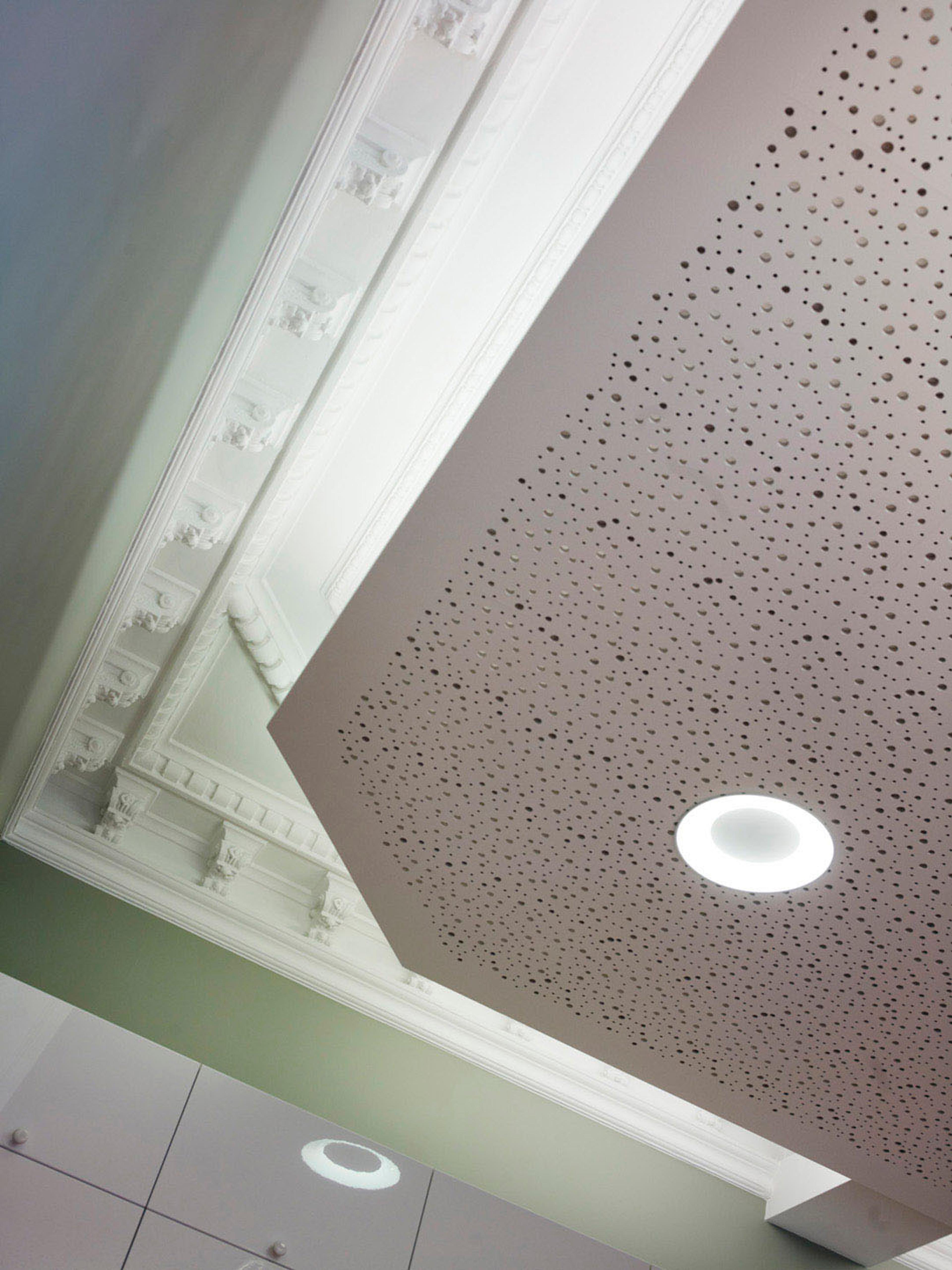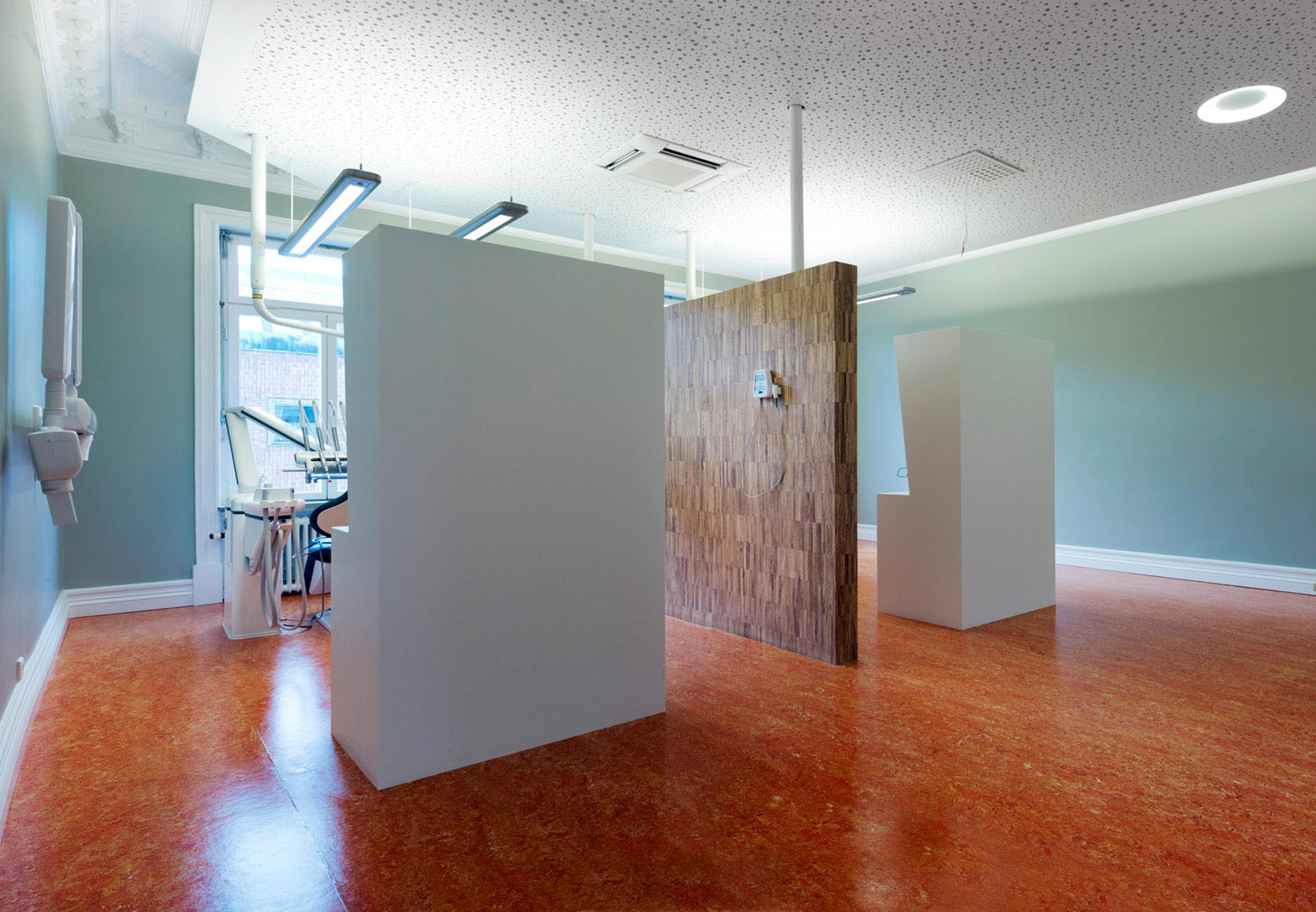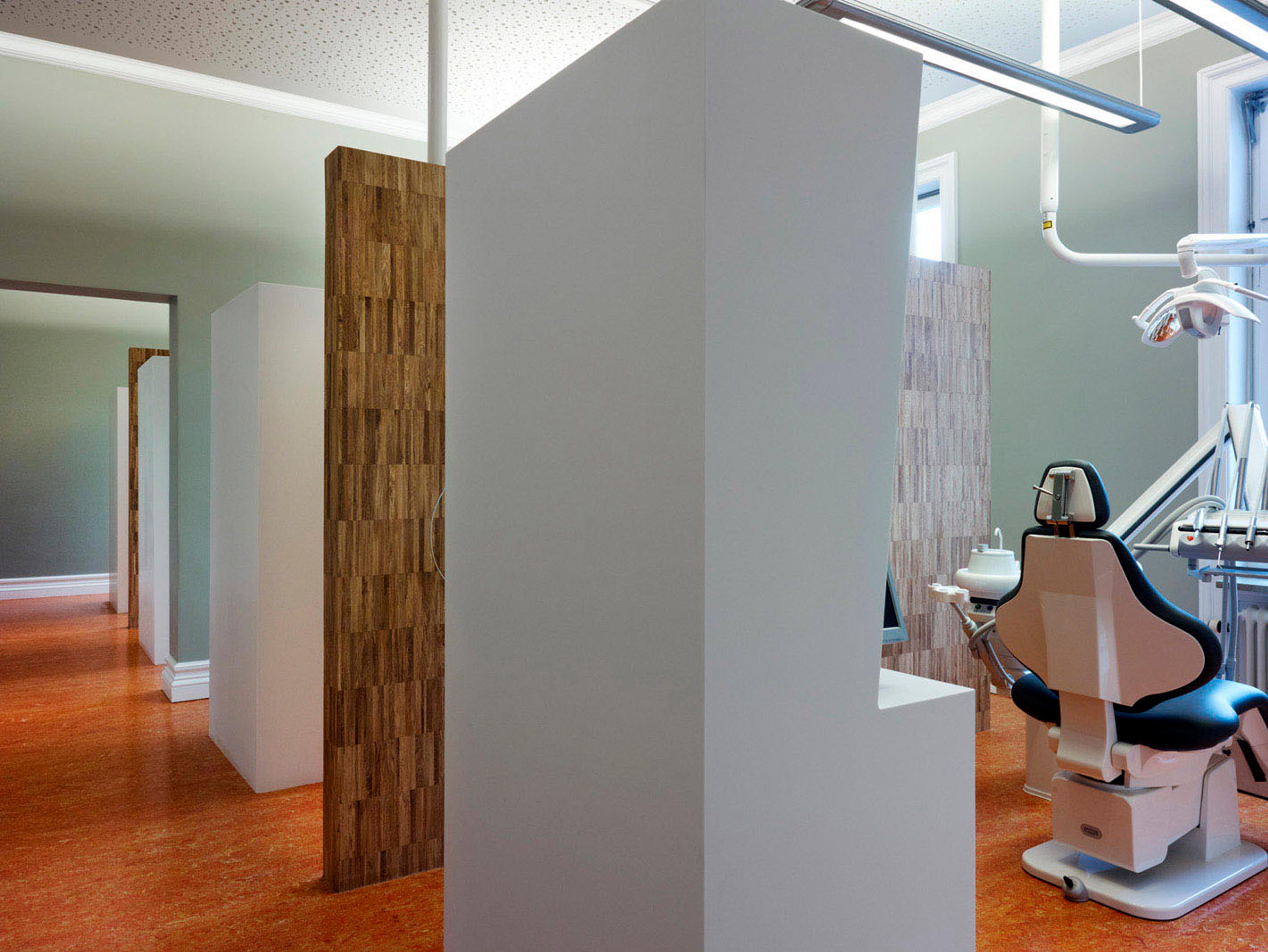 En bärande idé för inredningen var färgstarka golv. Den ekparkett som fanns kvar är slipad och behandlad med olja. Plankgolv i personaldelarna är målade med täckfärg. Behandlingsutrymmena har mörkbrunt linoleumgolv. Receptionsdisk och behandlingsenheter är specialdesignade för projektet. Skärmväggar likaså, de avdelar de olika behandlingsrummen och har två syften. Det ena är en effektiv plats för tandläkare och sköterska där allt som behövs finns nära, det andra att patienten inte ska känna sig instängd och trots storleken uppleva ett större rum. En tandläkarmottagning innebär många installationer och i behandlingsutrymmena krävdes undertak. Undertaken avslutas innan vägg för att stuckaturen ska vara synlig även i dessa rum.