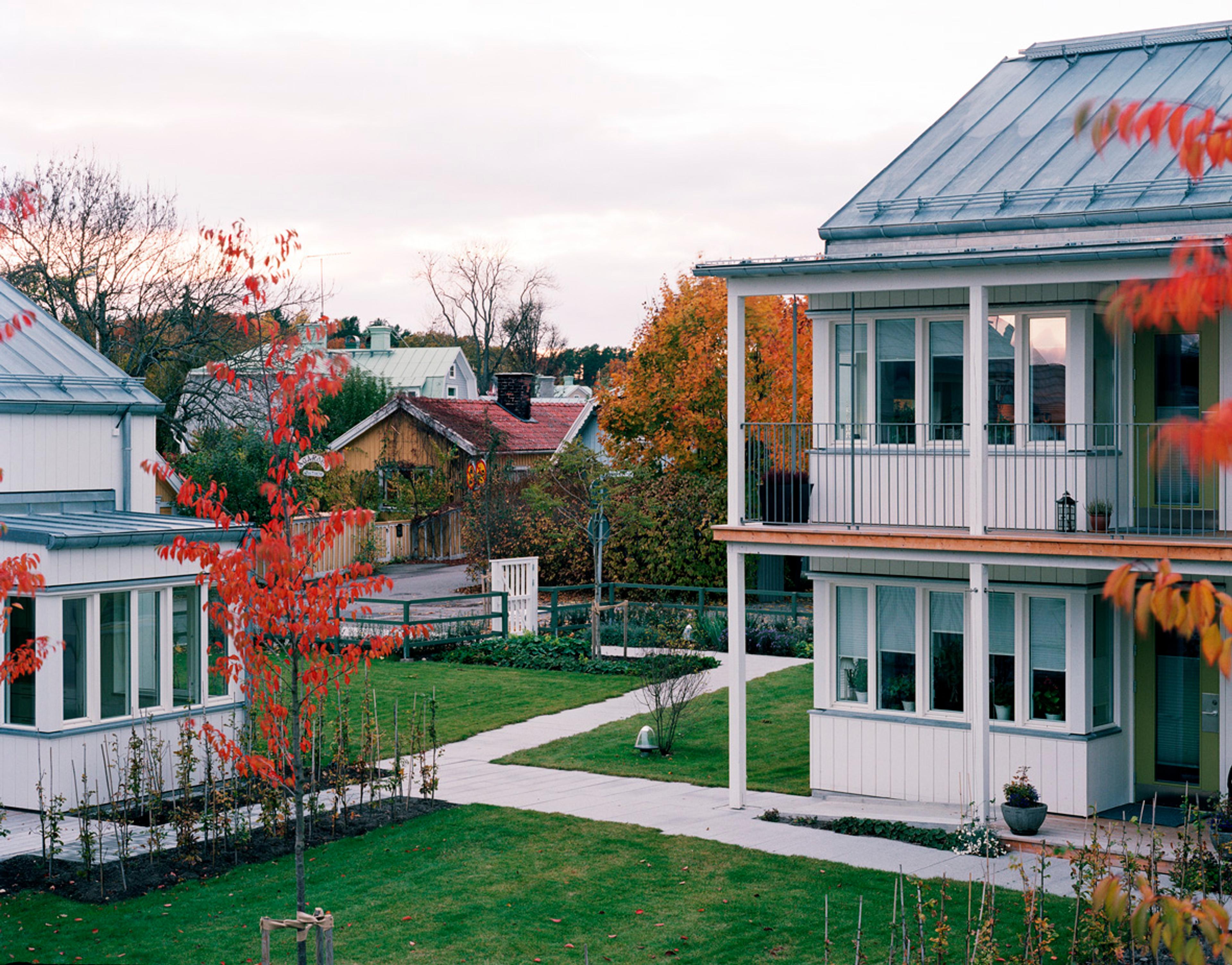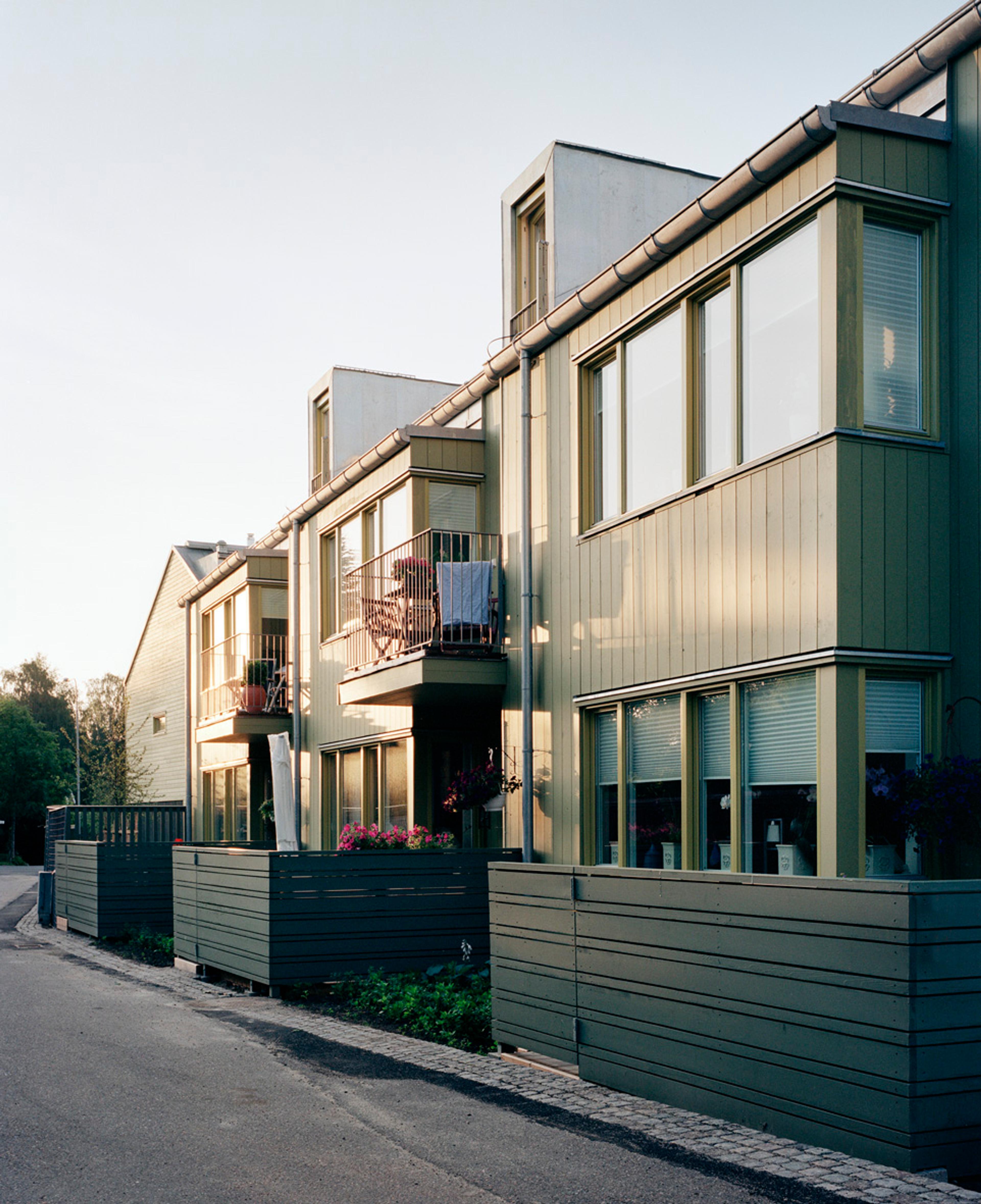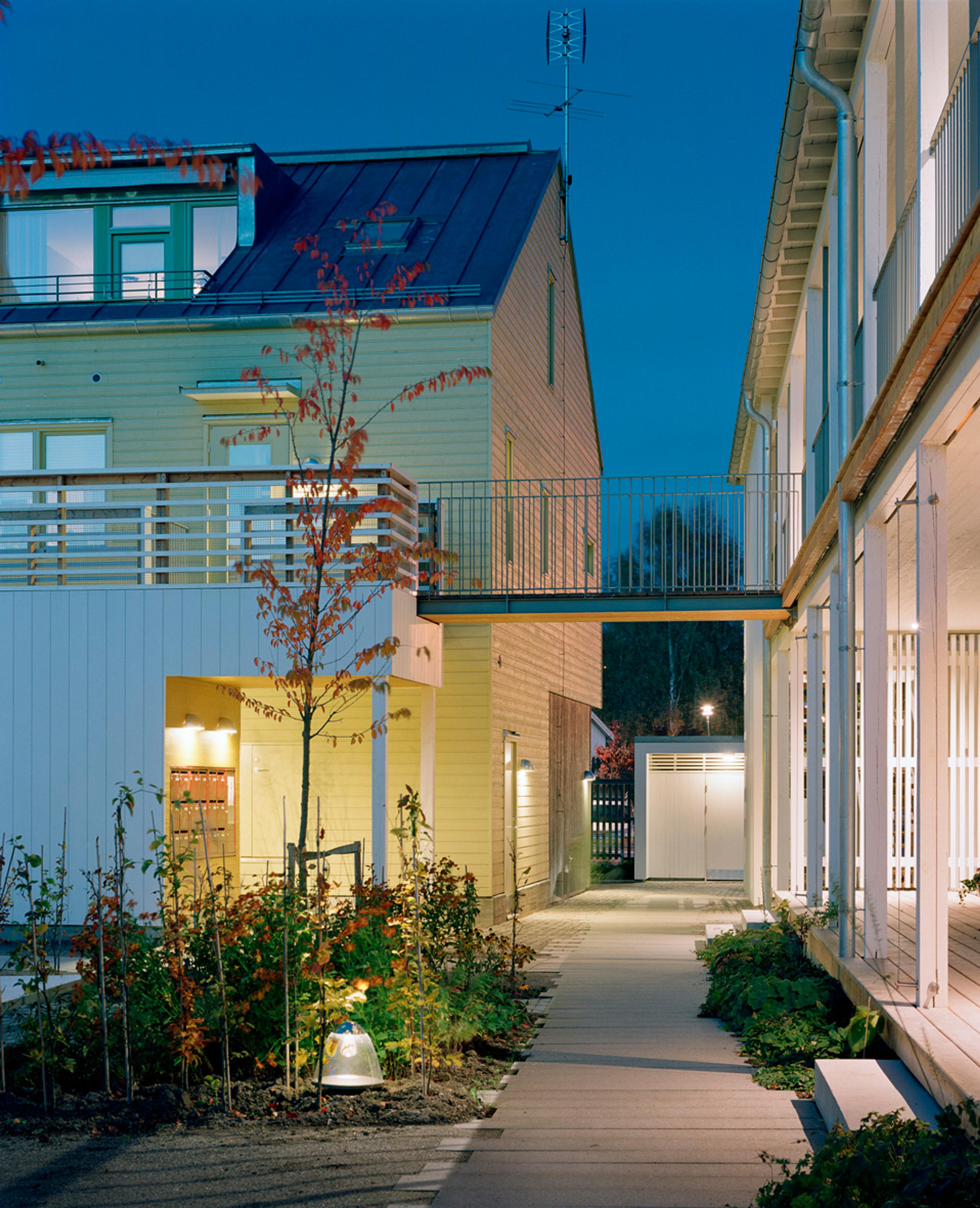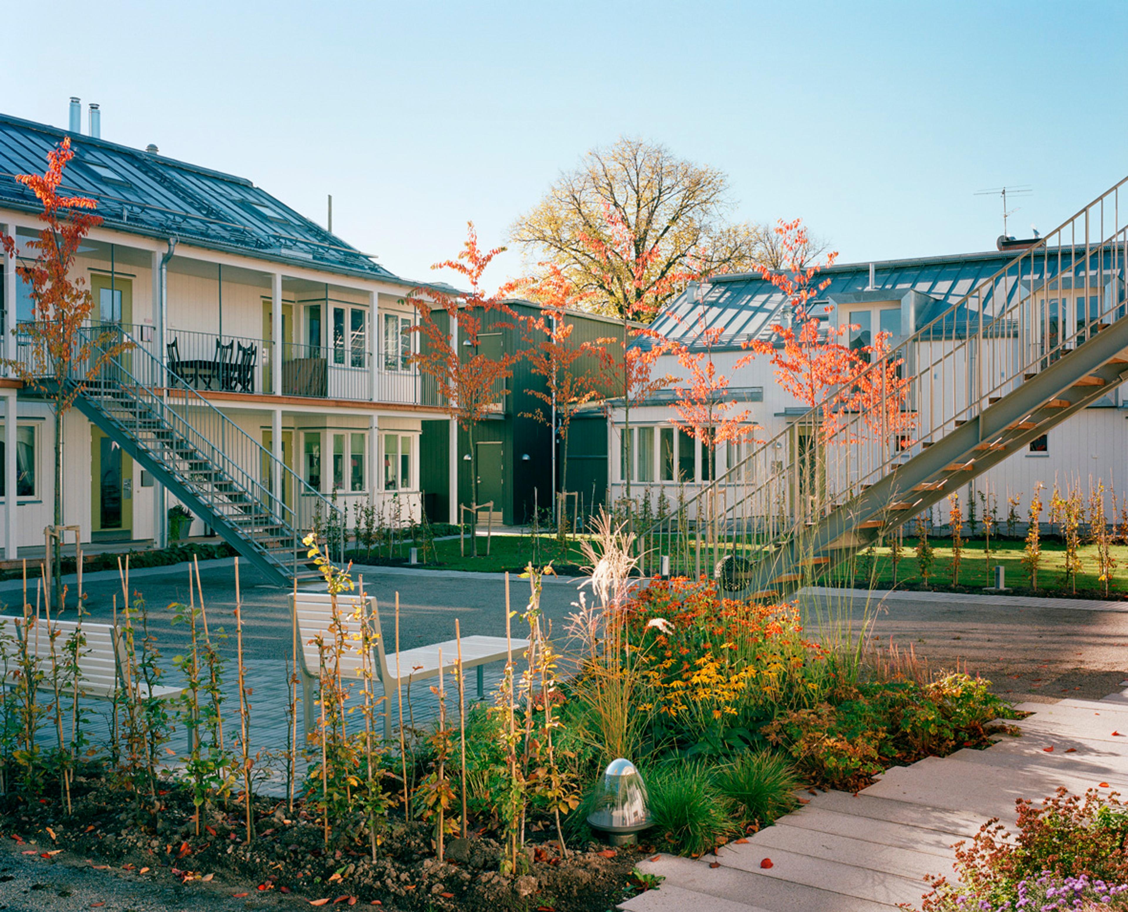Fiskpigans 17 lägenheter har entré och uteplats mot gården vilket har visat sig ge en stor social samhörighet. Ett koncept vi senare har arbetat med i större skala, se Brf Flatön.