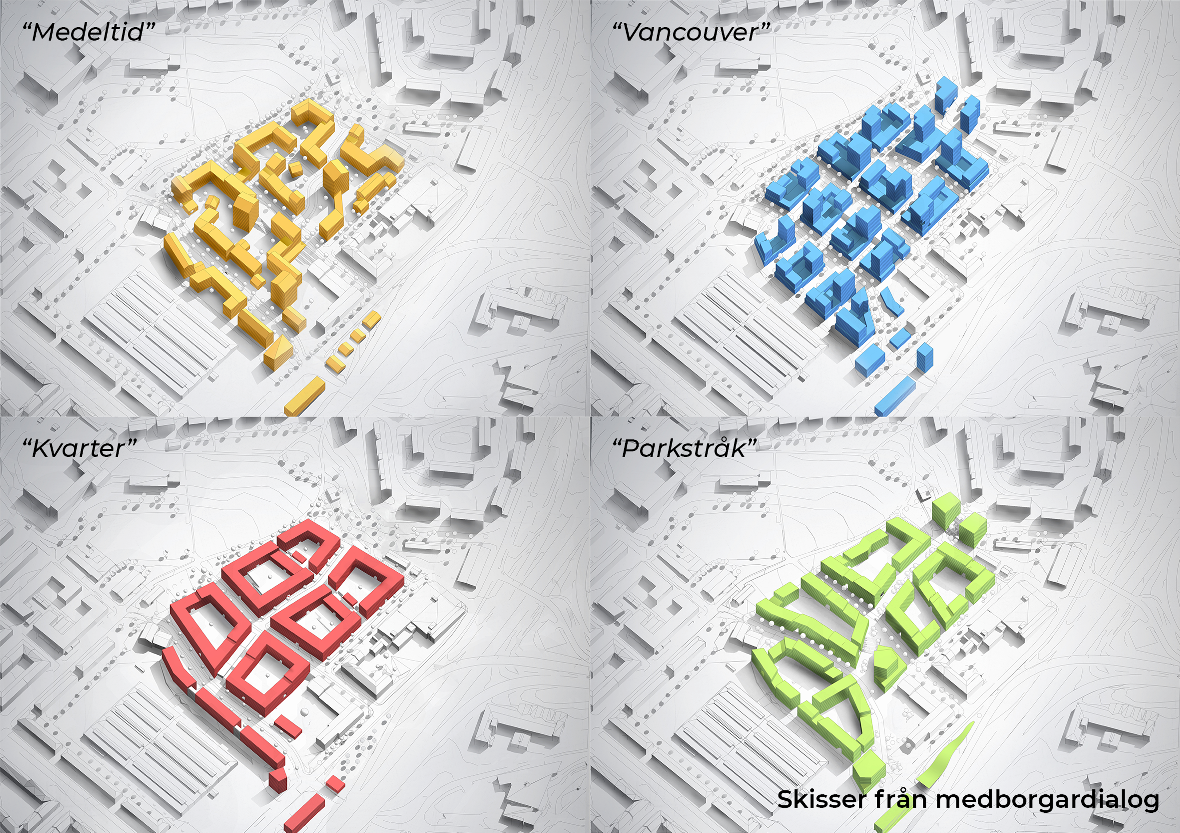 Vi prövade fyra olika stadsplanestrukturer som en del av arbetet med planprogrammet. För att främja medborgardialogen presenterades dessa strukturer i en workshop på Majornas Bibliotek och publicerades även i Göteborgs-Posten. Klassisk kvartersstruktur kunde jämföras med en mer organisk, medeltida struktur eller en kvartersstruktur lånad från Vancouver med lägre hus mot gator. Eller varför inte ett grönt parkstråk genom hela området upp till Sandarna?