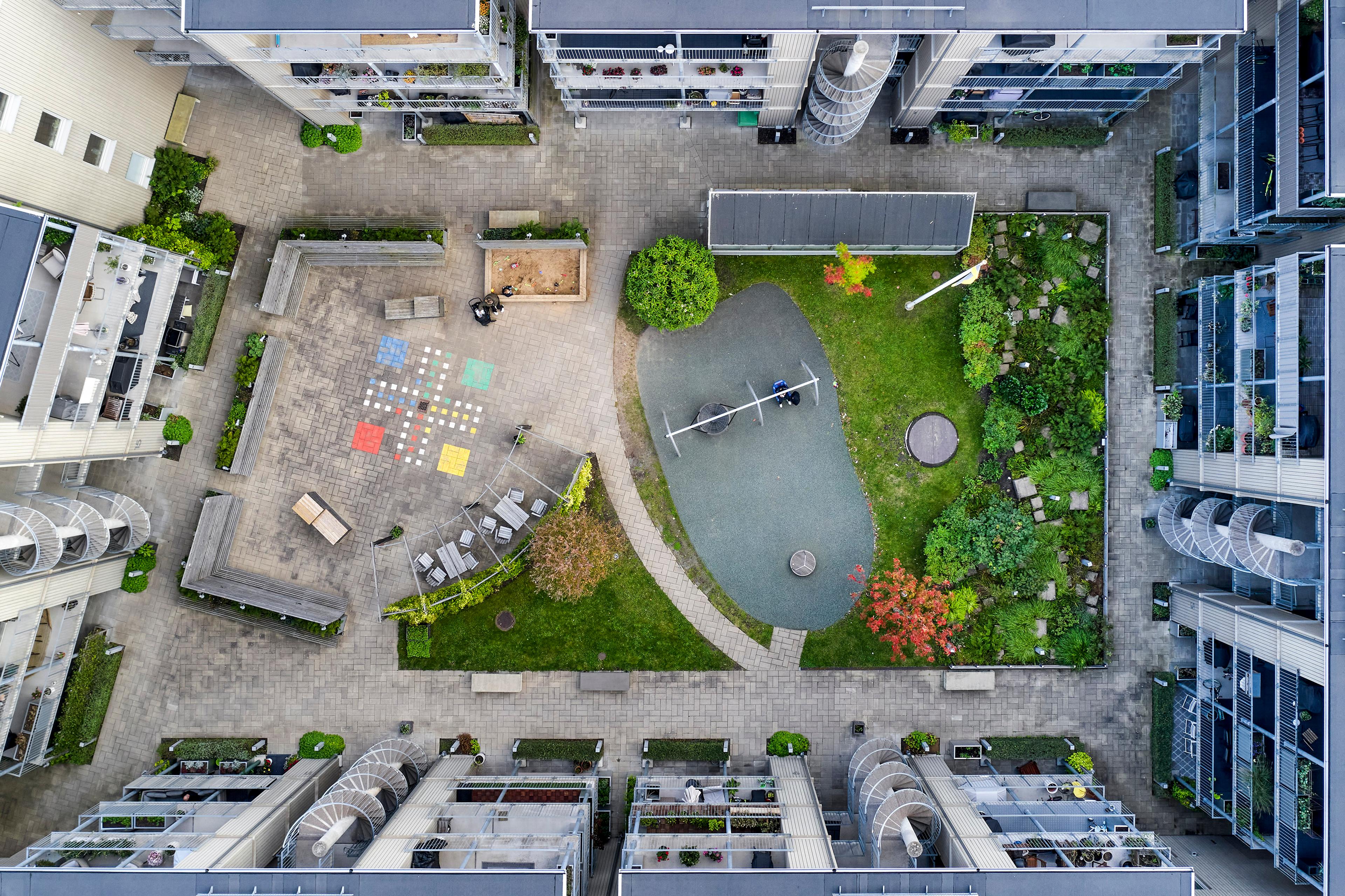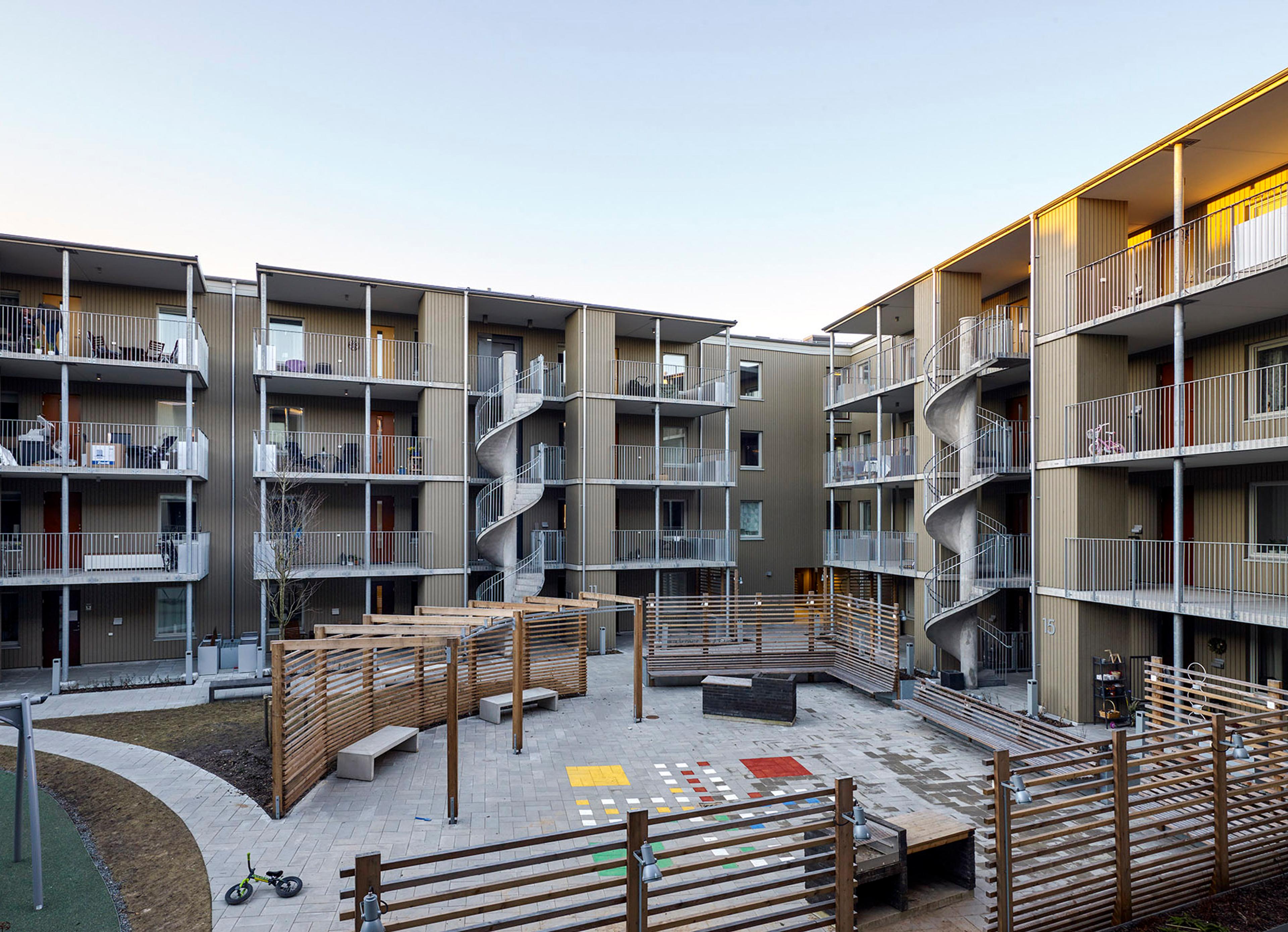 BRF Flatön består av 85 lägenheter med inriktning på att skapa förutsättningar för sociala kontakter och boende för familjer. Två portiker leder in till gården varifrån samtliga entréer nås. Entréterrasser och utvändiga trappor har bidragit till ett livligt och väl använt gårdsrum. Lägenheterna har flera alternativa planlösningar som gör det möjligt att förändra bostaden. Familjer har olika behov och de ändras över tid.