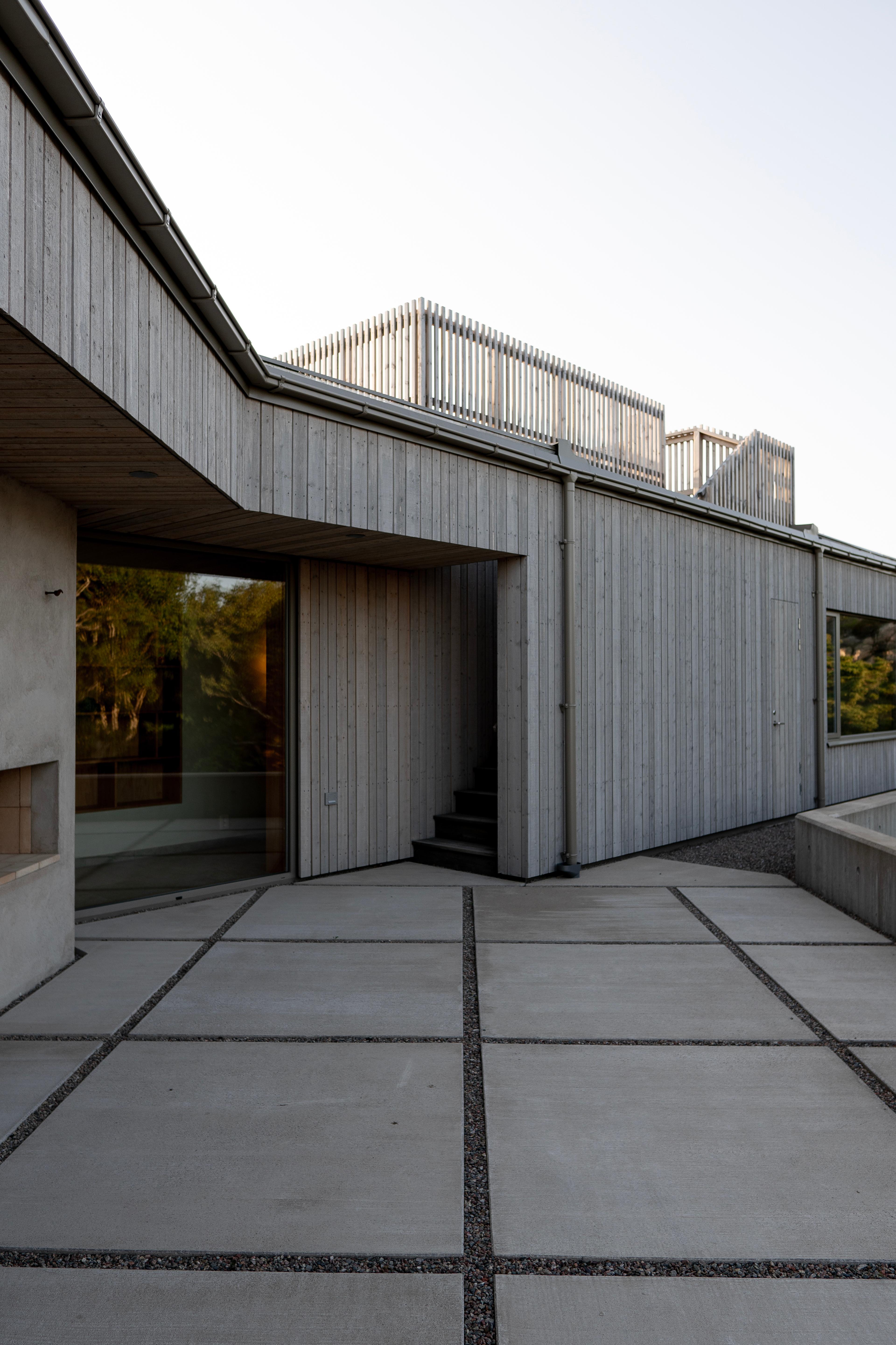Det som först var tänkt som ett hus delades i två. Som en anpassning till topografin är byggnaderna vinklade så att de följer de naturliga höjdkurvorna. En betongmur skapar en platå för huvudbyggnaden och dess uteplatser. Gästhuset är ett souterränghus med ingång från klåvans trädgård. Muren och byggnadernas olika nivåer länkar samman klåvans övre och nedre del.