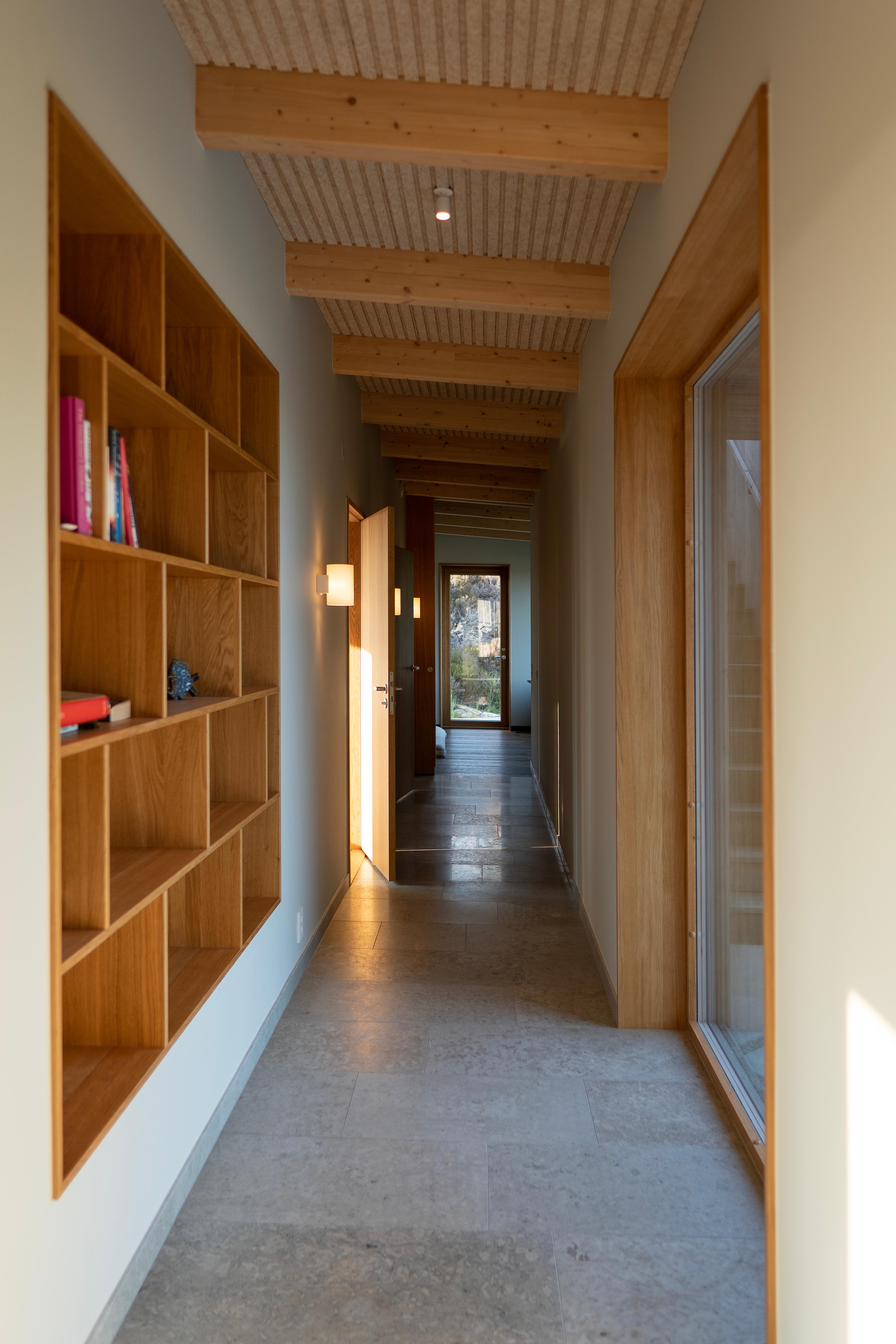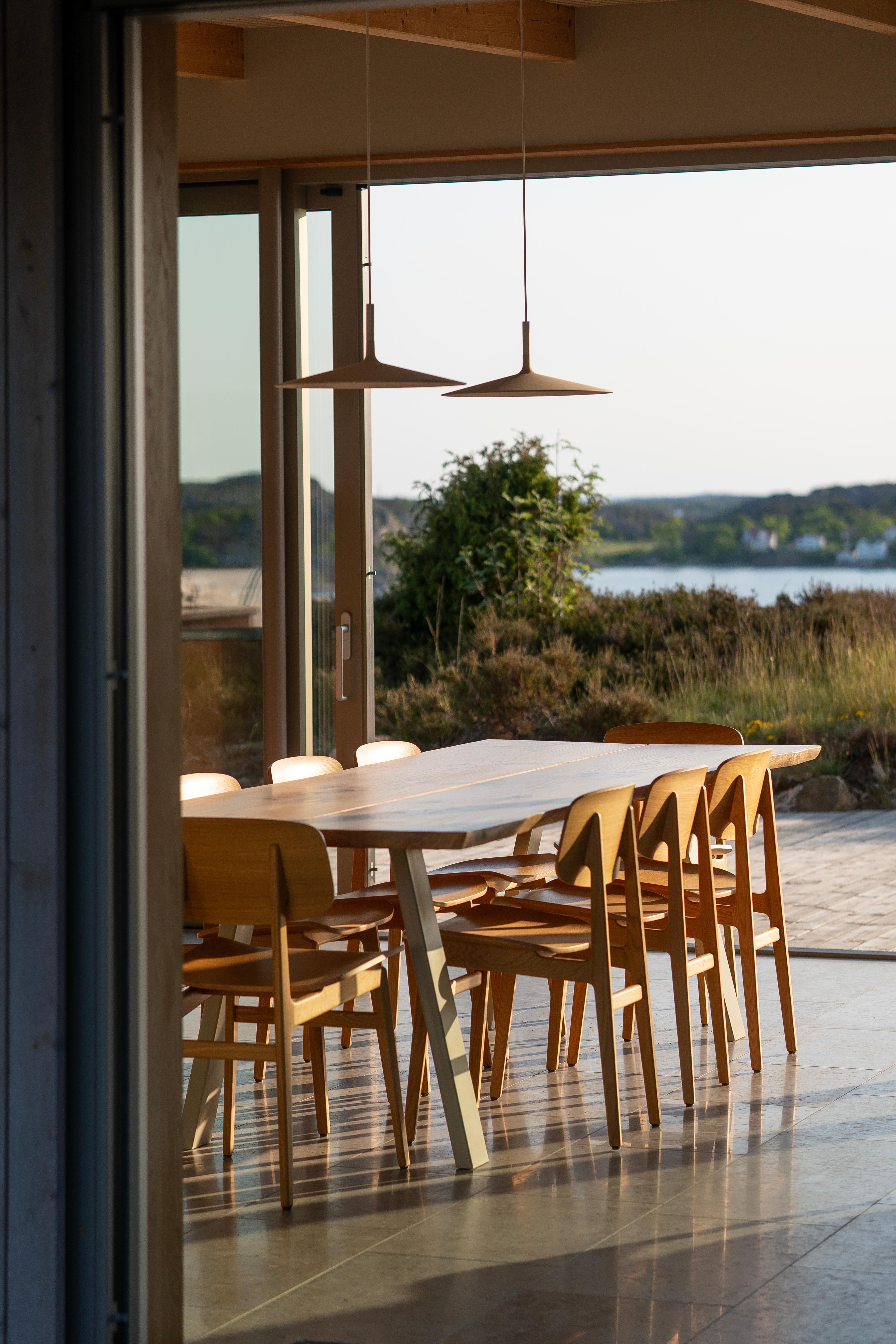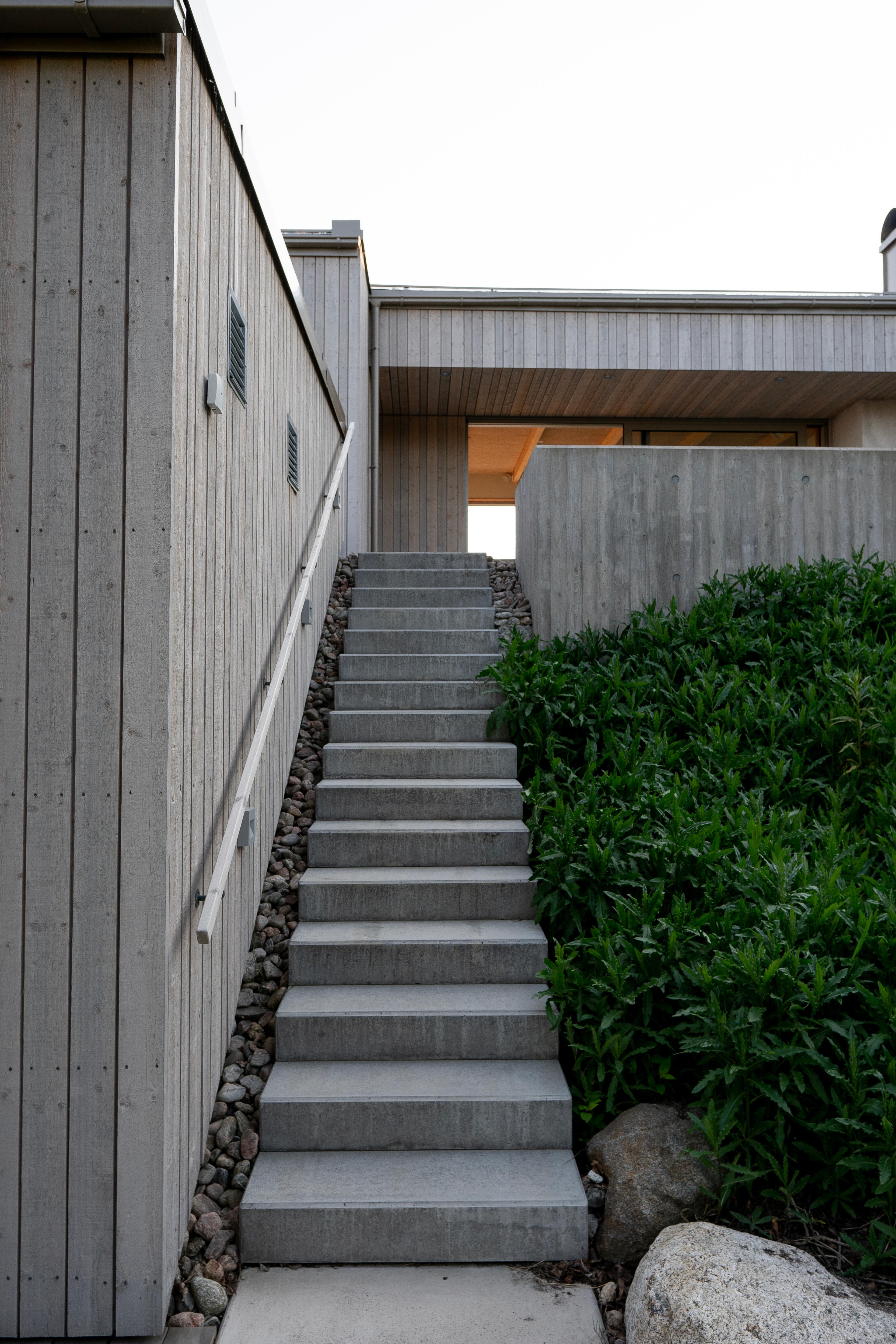 Byggnaderna bildar en gräns mellan vind och lä, kargt och frodigt, det stora och det lilla landskapet. I huvudbyggnaden centrala rum möts dessa olika sidor via stora glaspartier.
