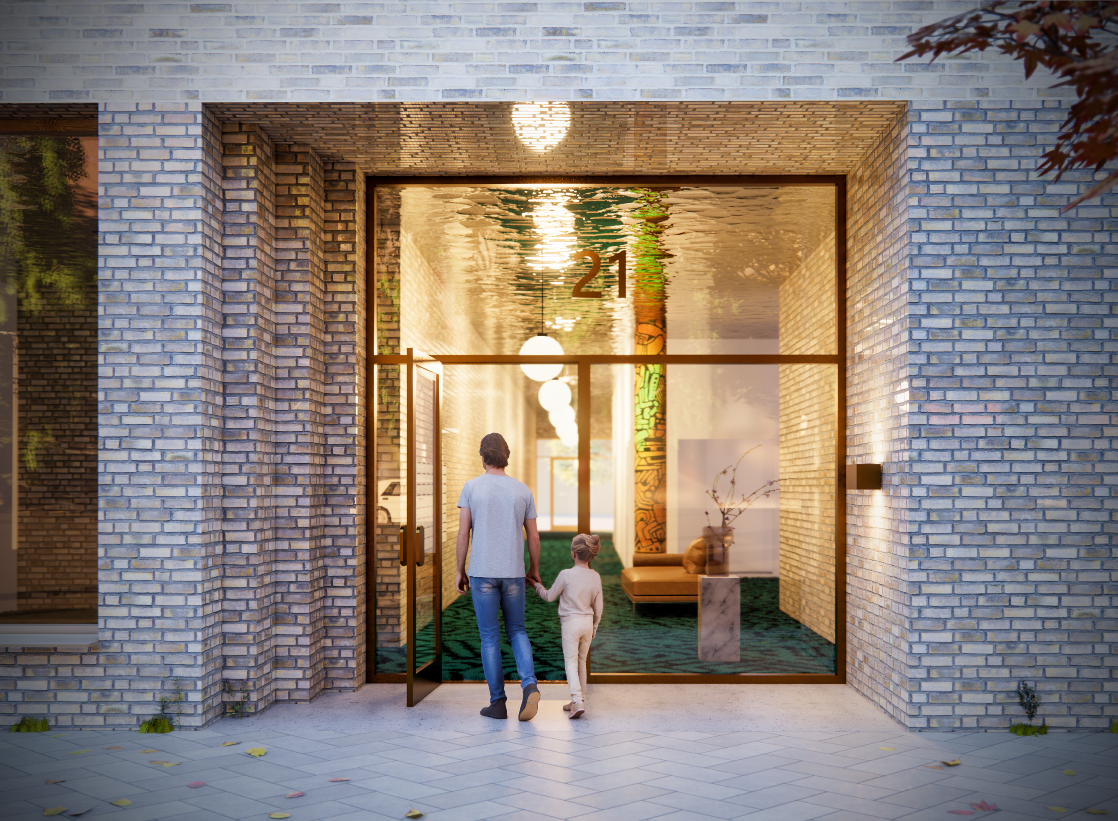 De tre första våningarna fyller ut hela kvartersmarken men för bostäder var kvarteret för litet och byggnaden för hög för ett traditionellt kvarter med gård. Istället skapade vi upphöjda gårdar mot gatorna och byggnaden delades upp i flera volymer. Gårdarna får bra ljusvärden och byggnadsvolymen ett slankare och mer varierat uttryck.