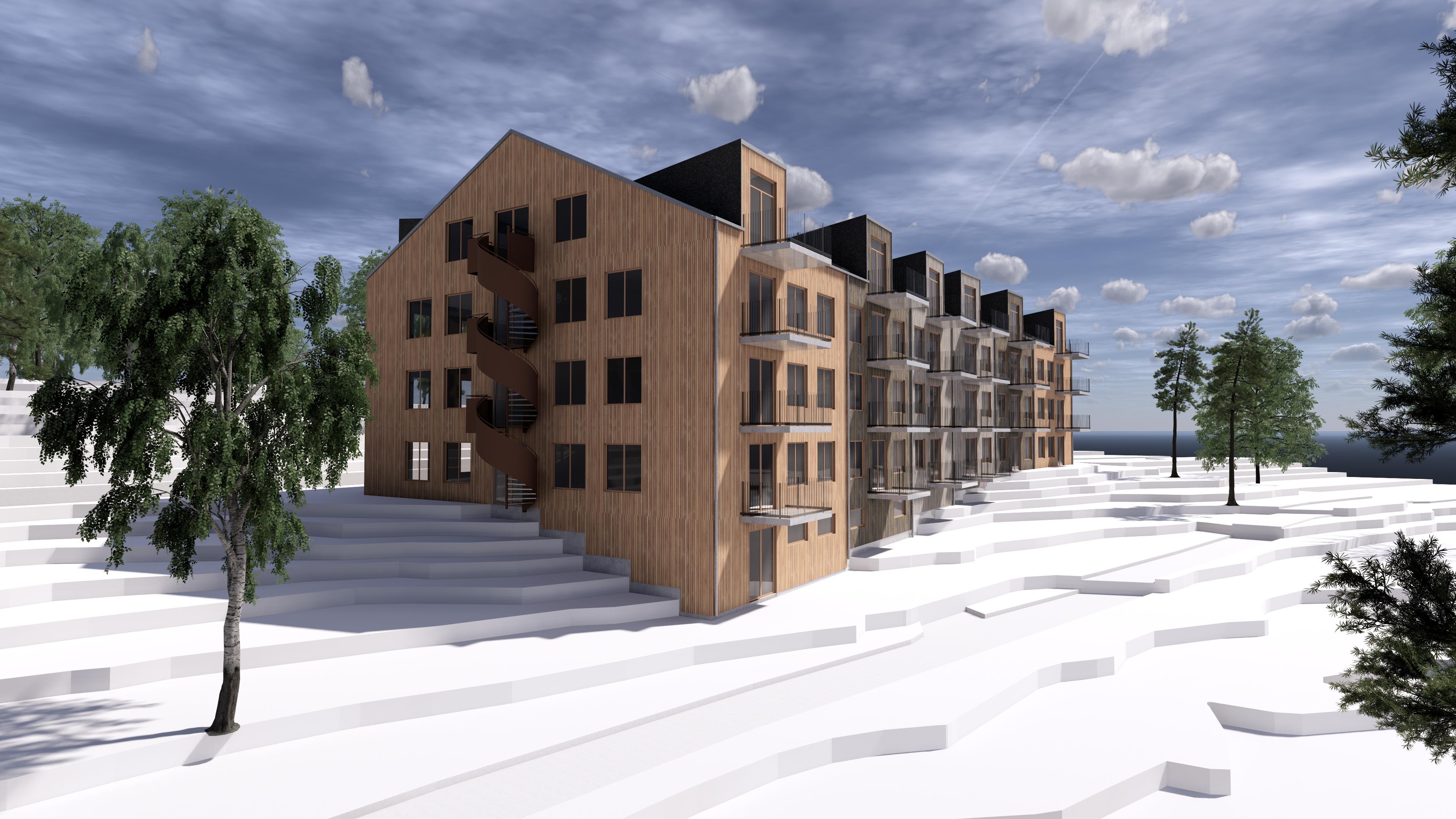 Var för sig har byggnaderna en ganska stor volym. För att få känslan av en mindre skala är byggnaderna vikta på mitten vilket halverar fasadlängden. Fasaderna är också indelade vertikalt med hjälp av stuprör, kulör och stora takkupor. Träpanelen är skarvad på längden, vinsten är att horisontella skarvar med plåtbleck undviks. Kulörerna på lasyren har valts för att harmonisera med den naturmark som bevarats mellan byggnaderna.