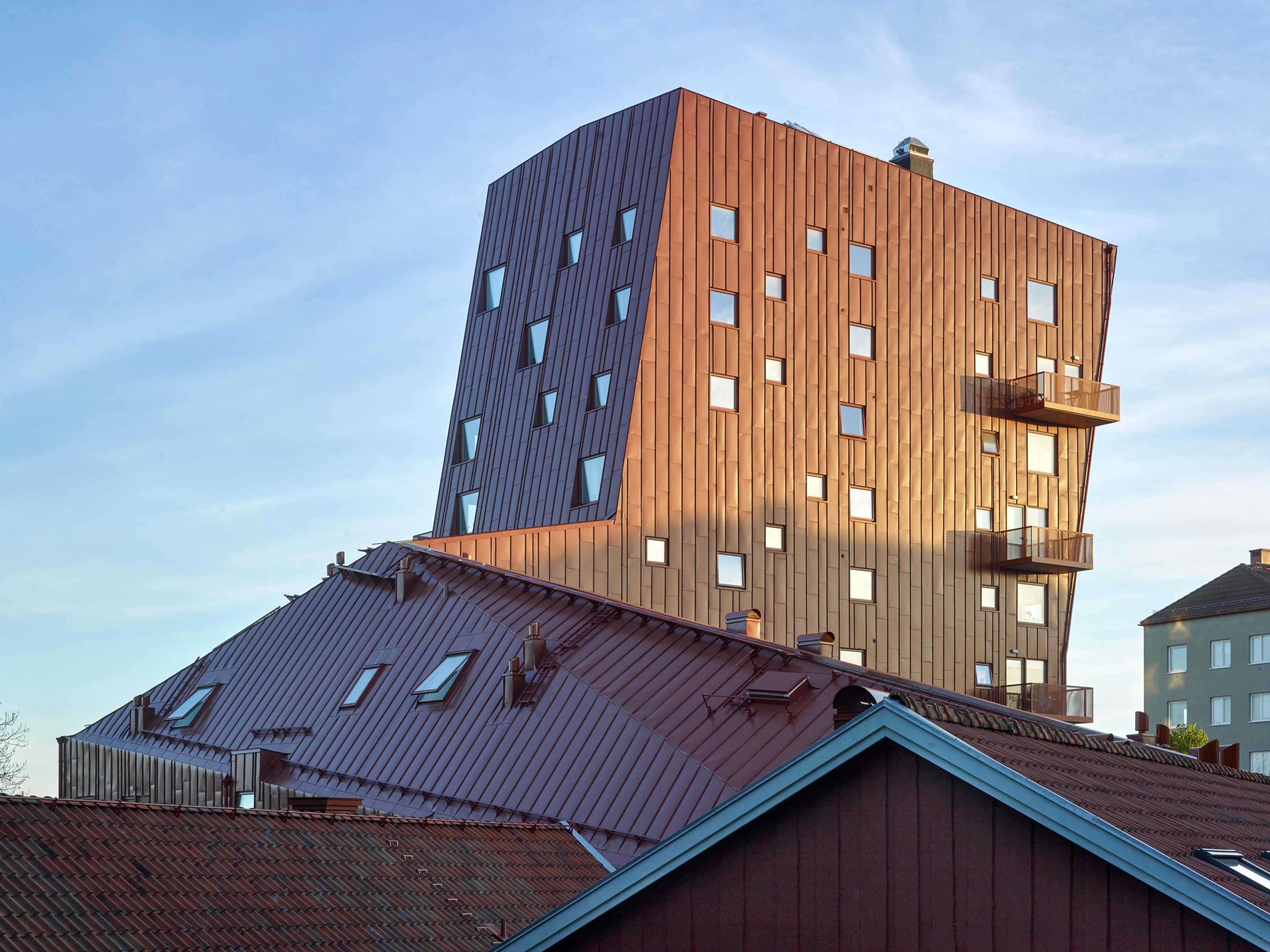 Formen är resultatet av att anpassa volymen till de omgivande byggnadernas skala. Från anslutningen i den äldre ekonomibyggnaden växer den gradvis och reser sig till 10 våningar mot Inägogatan och dess punkthus från 50-talet.