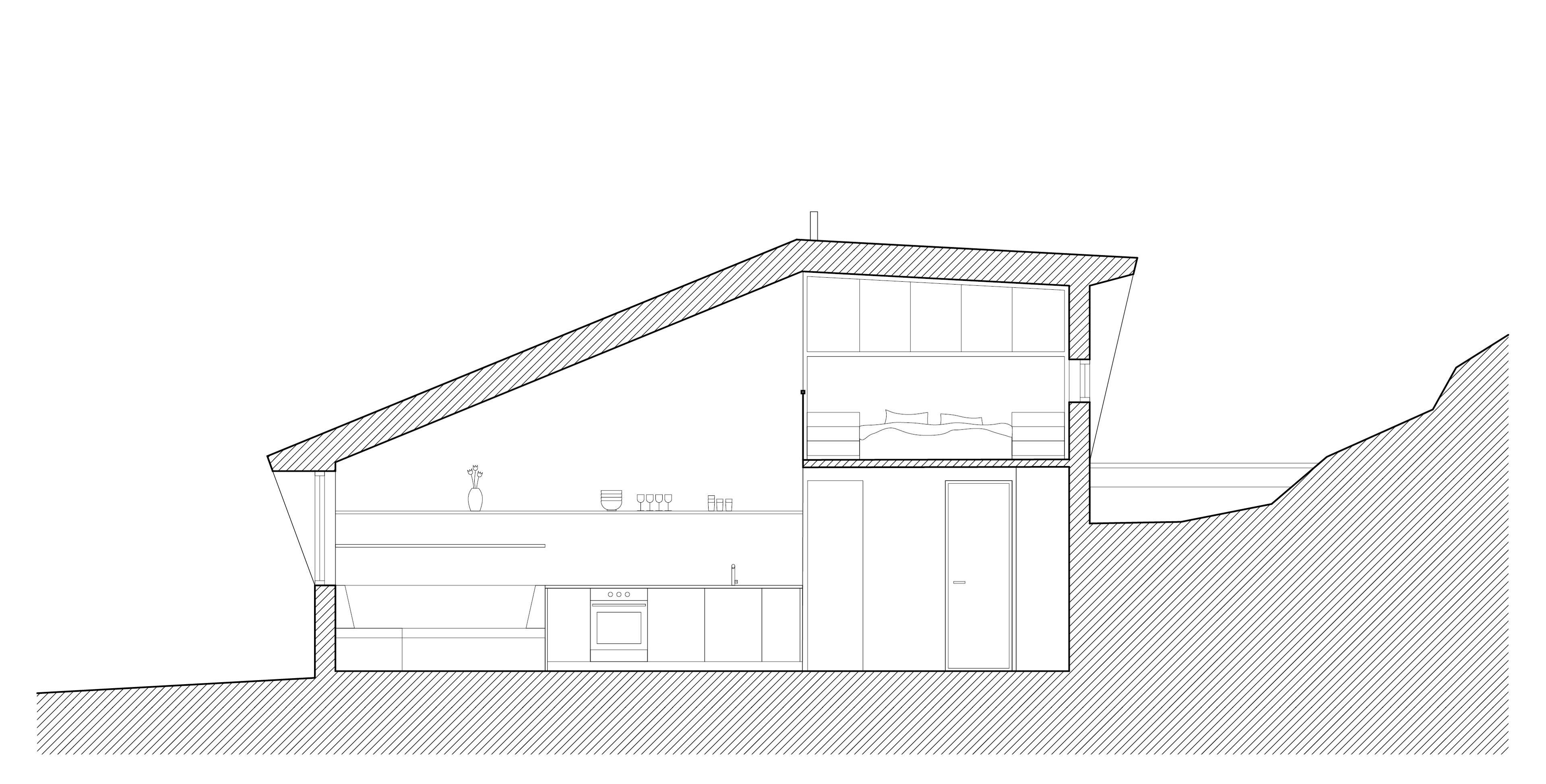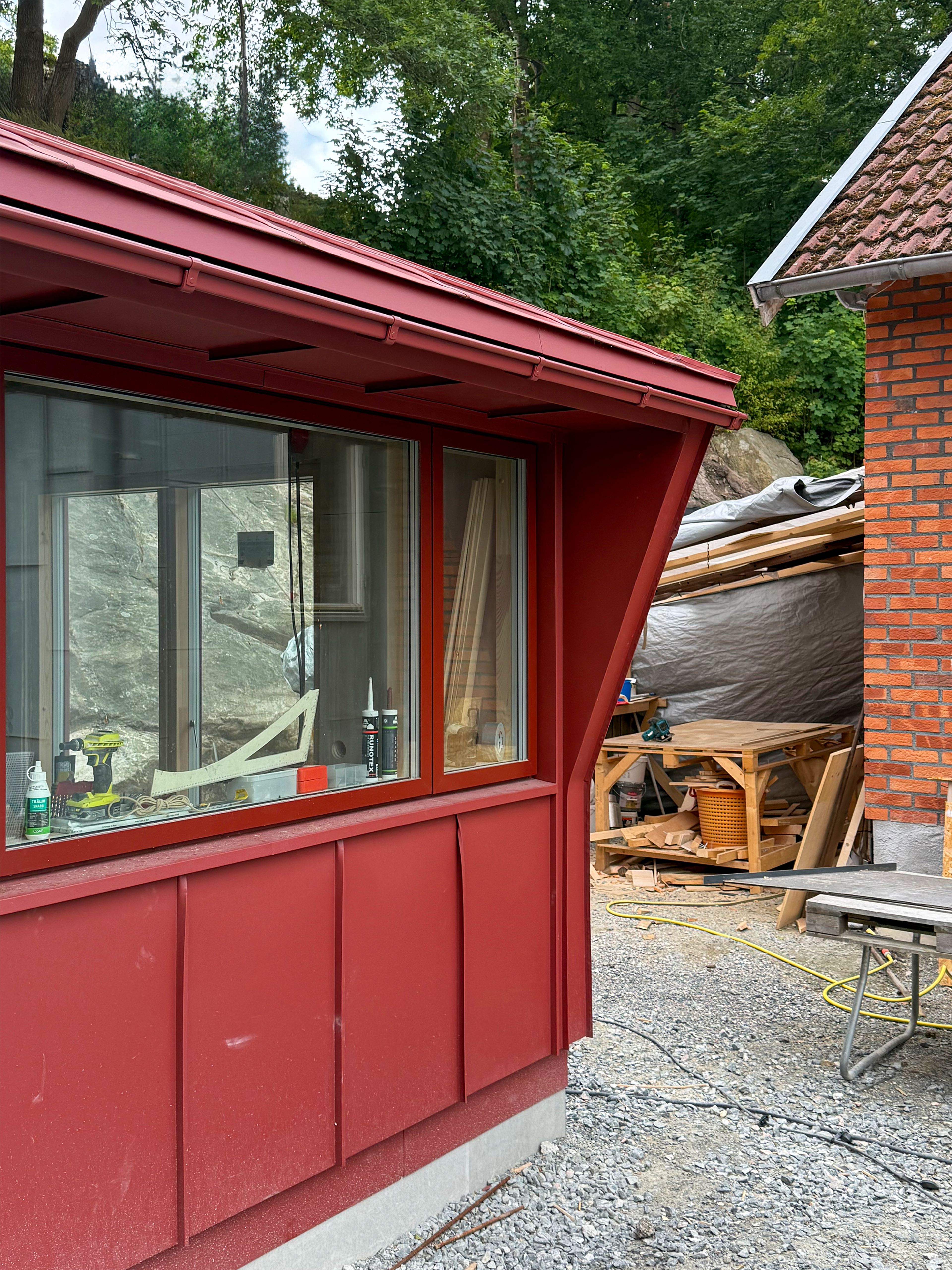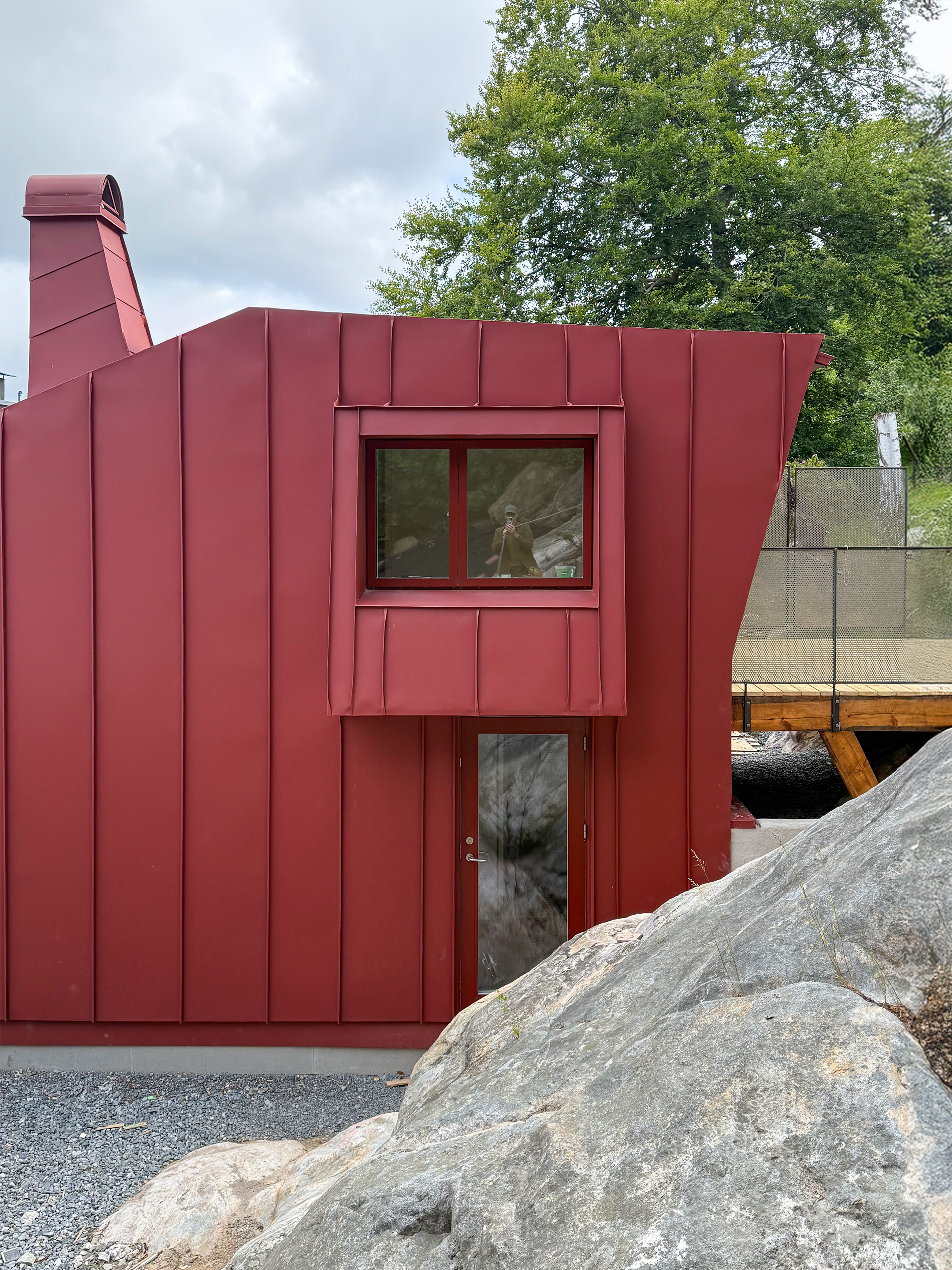Husets form knyts ihop i en enhetlig röd falsad plåtfasad vilket förstärker Skuggsvans geometri. Formen gjorde det möjligt att få till ett loft med ståhöjd. Från loftet når man en brygga som ansluter till berget. En ram runt fönstret ovanför entrén riktar sig mot bergsidan och de stora träden i söder.