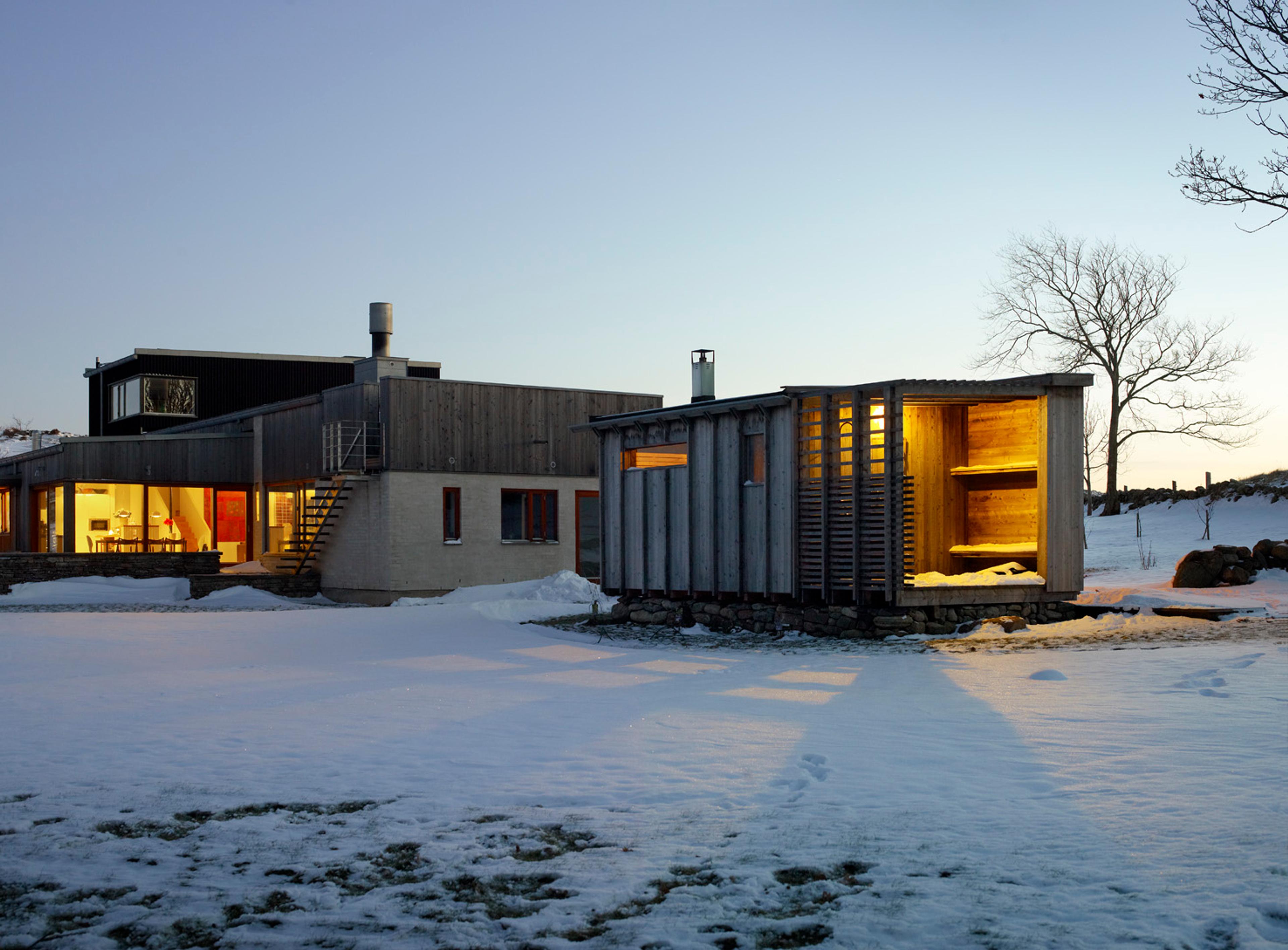När byggnaden ses från avstånd påminner det om en tät samling av mindre byggnader. Det förstärks av komplementbyggnader som bastu, carport och växthus. Ytbehandlingarna är valda utifrån att de ska vara diskreta i förhållande till omgivningen.